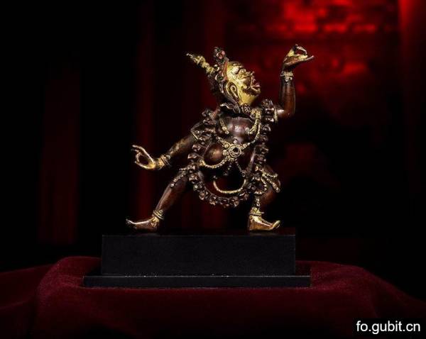 此尊造像极为精致,官造采用烧古工艺,泥金过的脸部说明曾是在寺庙供奉。无论是婀娜的身姿或是匠心的装扮都很吸人眼球!空行母具一面两臂三目,面容圆润,五官精致传神!头戴骷髅宝冠,耳挂巨型圆铛,多余的长发飘于身后,发丝缕缕分明,慧眼圆睁,呈寂忿相;身形袒露,丰乳细腰,肌肉质感塑造的十分逼真,躯体向一侧微微扭动,为庄严造像添上一抹灵动!左臂曲肘上扬高举gabala碗(丢失),上仰的头,仿佛正在张口饮用里面的颅血,右手结期克印持金刚钺刀(丢失),手指上翘,生动入微!周身戴各种珍宝首饰,飘动的缯带以及繁缛的璎珞,无不刻画细腻生动,项前还挂一串人骨项链,白骨森森,甚是恐怖!腰系璎珞裙结于身后,珍宝清晰可分,仿佛有风吹来便能叮当作响,工艺震撼之度绝不逊色大造像!双腿有力,以左展姿态站立。整像铸造刀法娴熟,人物肌肉丰满,动感强烈,身姿婀娜,堪称最美背影,刻画的栩栩如生,艺术性极强,仿佛充满了灵气,充分表现了空行母降妖伏魔的威猛气势!