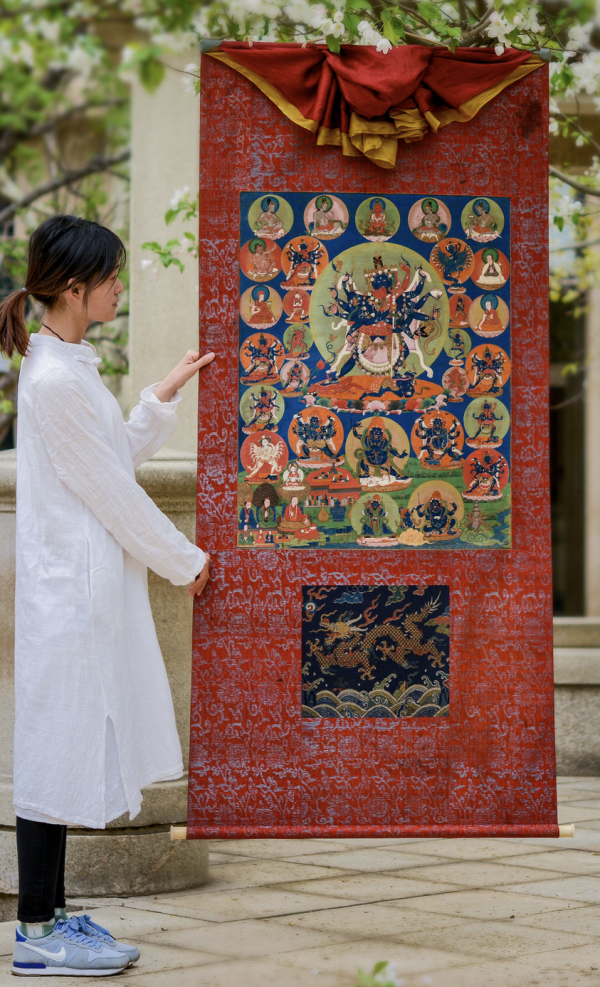 钦则画派在15世纪中期以后流行于后藏和山南地区,其画师大多受萨迦派高僧赏识和支持因而该派的影响力与萨迦教派的兴衰密切相关。钦则画派从兴起到衰落,时间较短,影响更多反映在具体的造型与技法方面,是近世西藏绘画的重要源头之一。这一画派在十八世纪后便少有作品传世,能保留下来的此派绘画作品已然非常少。龘藏此次春拍第二场封面,所呈现的就是一幅非常罕见且品相完美的,钦则画派中期胜乐金刚唐卡。