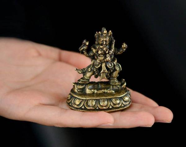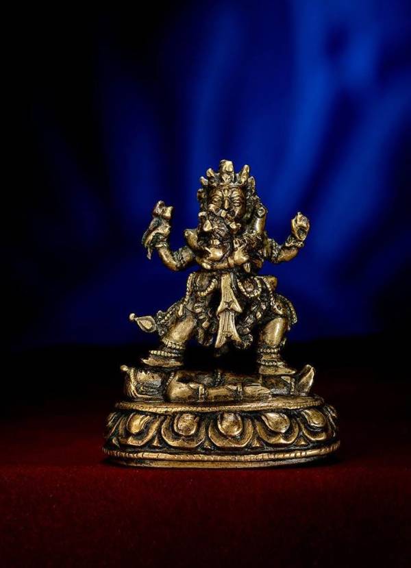 此尊为极其罕见的永宣风格胜乐金刚双修题材随身佛,整体尺寸小巧,造型更是灵动优美!除佩戴的头冠、宝缯、耳环、五十颗鲜血人头项链、手镯、臂钏、脚镯和璎珞等珠宝饰物外,并裸露全身,充分展示出人体的艺术魅力!不过艺术家还通过胜乐金刚的面部、尤其是双眼和唇部微妙、夸张的神情的渲染,和明妃环绕主尊颈部的左手、环绕腰部双脚等姿势的刻画,着力营造出胜乐金刚及其明妃达到智悲合一时、物我两忘的极乐状态,使这尊欢喜佛极具艺术感染力!金刚高大健硕,左手执金刚铃右手执金刚杵交叉于胸前拥抱明妃,后两手,一手持法鼓扬于虚空、一手持金刚骷髅杖(已丢失),右脚伸展、左脚屈弓,呈展左姿立于莲座之上;其明妃造型为一面二臂,双腿环跨胜乐金刚腰部,与金刚面部相视,极具艺术感染力,其中所展现出的精神和气质正是藏传佛教密法修行的精髓!不仅如此,小小造像整体保存的也是完好,熟润的皮壳华美而不奢侈,也更加烘托出一种高雅、华美和神秘的氛围!其下莲台莲瓣饱满挺阔,颗颗连珠细腻分明,而单层覆式莲瓣的设计也更显稳固!