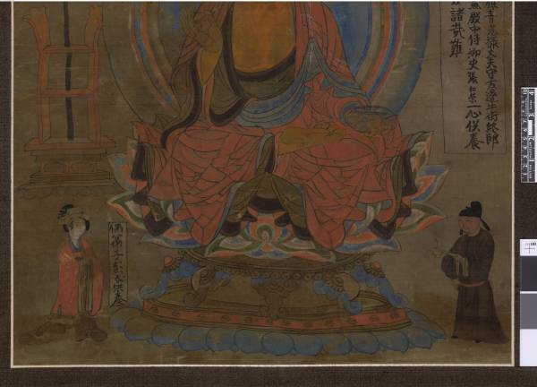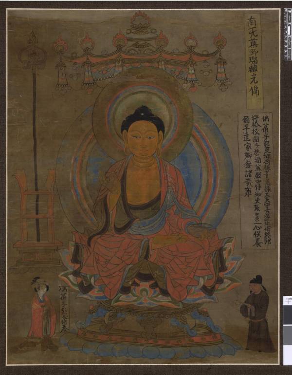 药师琉璃光如来头顶宝盖,法相慈悲安详,仪态庄严,乌发肉髻,双耳垂肩,著红色佛衣,坦胸露右臂,右手上举胸前结印,左手膝前捧药钵,双足跏趺于莲花宝座中央。右侧有锡杖安置于架上。此药师像是依不空译《药师如来念诵仪规》所绘。下方左右角各绘供养人,右侧为女,榜题“佛弟子彭氏供养”;左侧为男,其上方榜题为:佛弟子节度押卫银青光禄大夫守左迁(千)牛卫终(中)郎将检校国子祭酒兼殿中侍御史张和荣一心供养,愿早达家乡,无诸哉(灾)难。从榜题可以看出,此画为张和荣夫妻所绘制供养,张和荣当时为一守边将领,其供养药师佛的目的是“愿早达家乡,无诸哉(灾)难。”有资料显示张和荣曾在肃州镇守,从供养人像头上所戴的帽子看,应为晚唐时代。