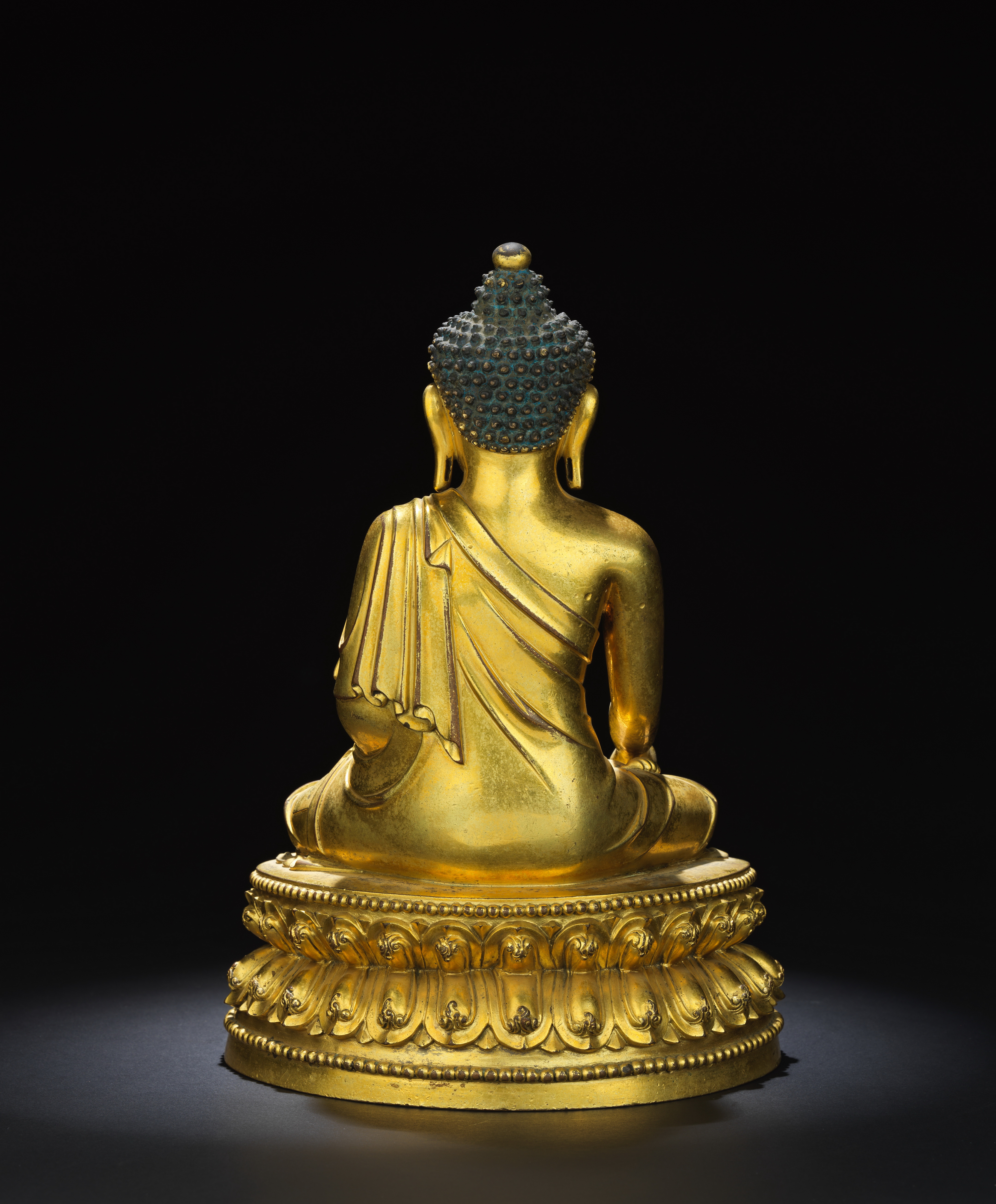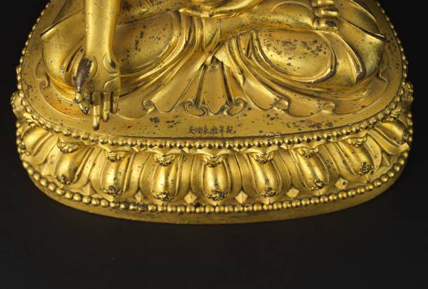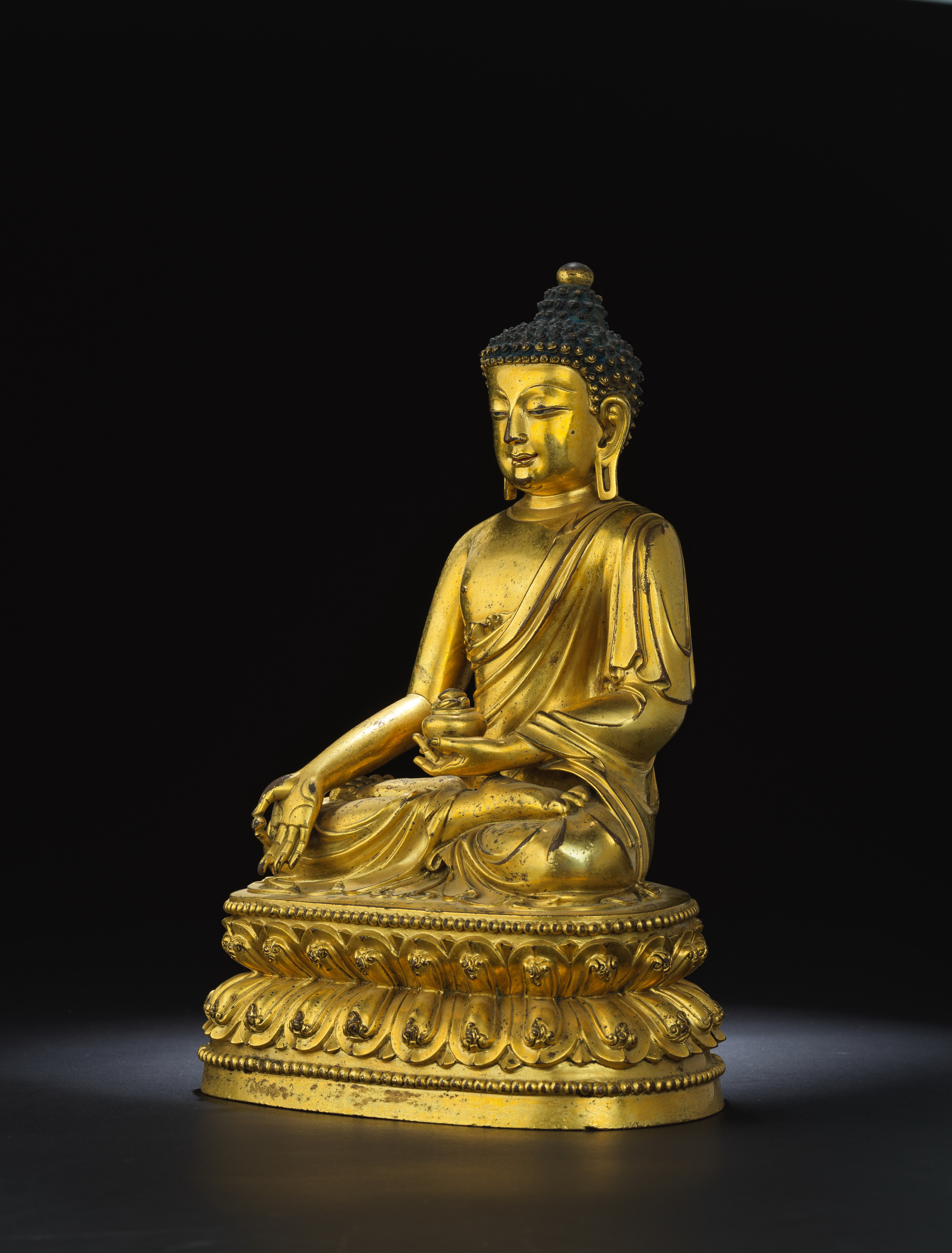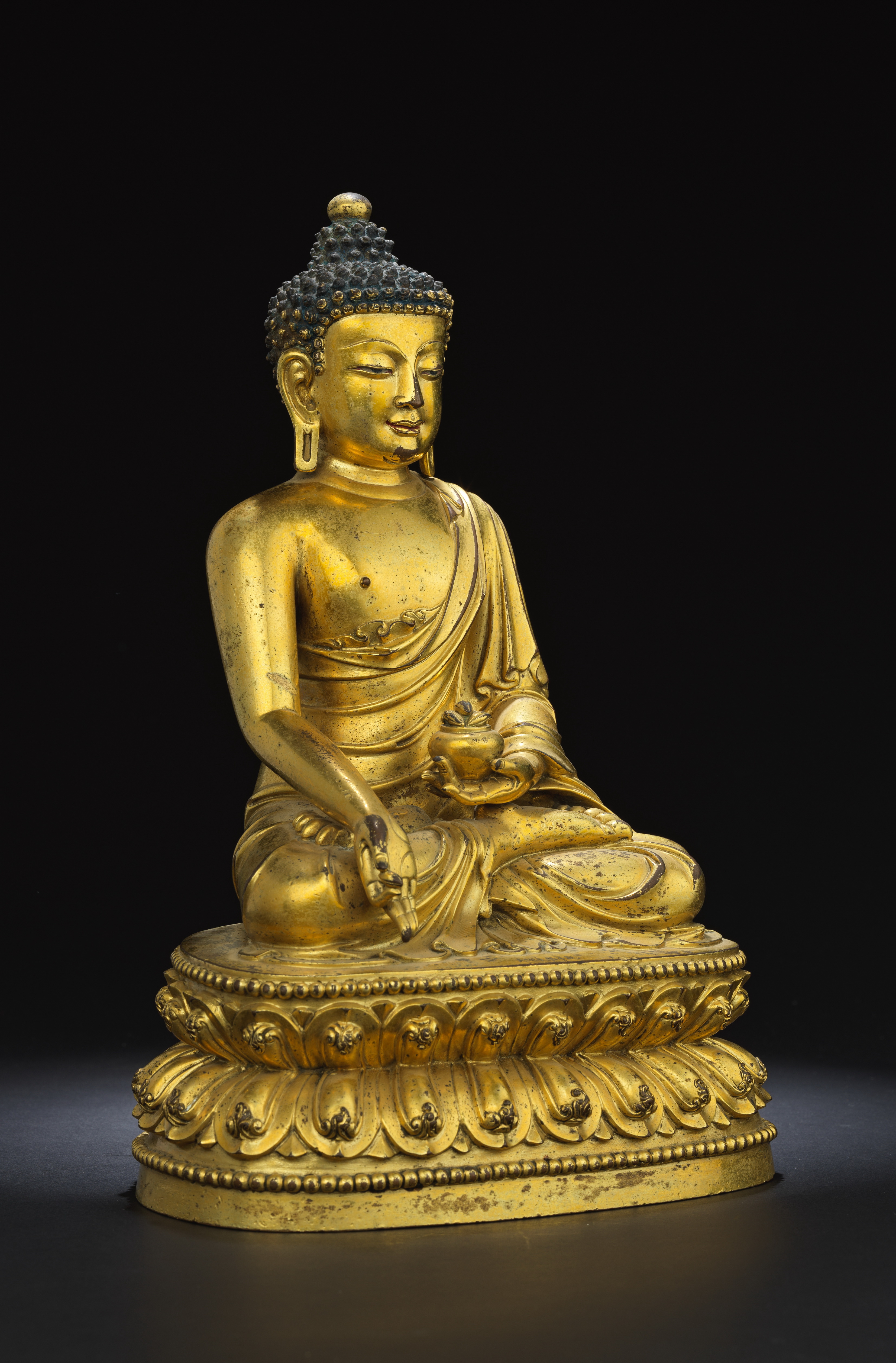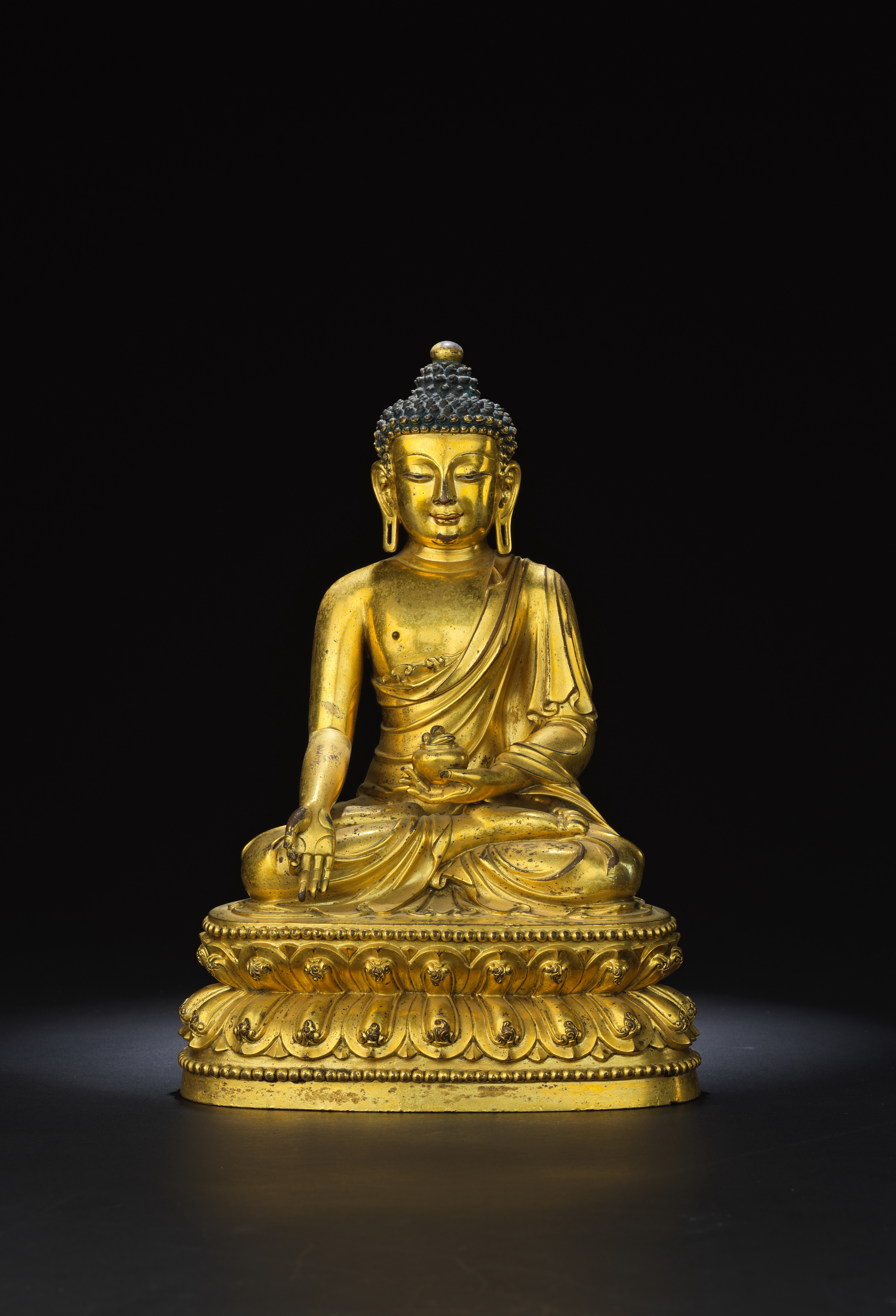 佛陀左手置于腹前,托药钵,右手垂在右膝前,施与愿印,跏趺坐于莲台之上。