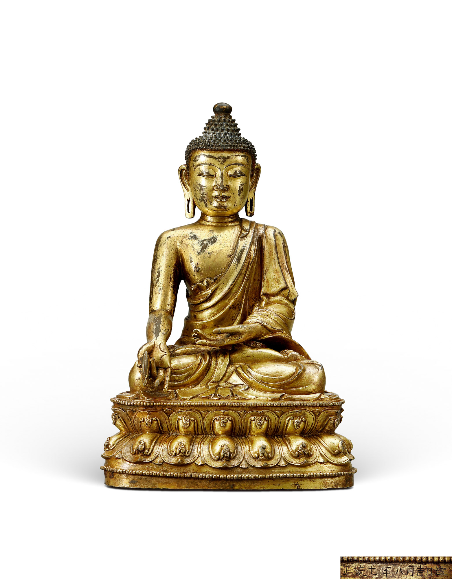 此尊铜鎏金药师佛佛造像,是比较典型的明代汉藏风格造像,具有正统造像的风格特征,显受永宣二朝宫廷鎏金铜造像之影响。面相圆润饱满,穿袒右肩袈裟,裙边于台座上自然铺陈,衣纹刻画流畅自然。莲座颇具特色,上下沿各饰连珠纹一道,莲瓣里外双层,内层挺立饱满,瓣尖饰上卷类火焰纹,我们在故宫博物院的藏品中找到一尊带铭文“正统六年七月吉日造”的观音菩萨坐像1,与本尊的莲座制式一模一样;另,青海博物馆藏一尊刻有“正统年奉佛段福龙施”款识的不空成就佛造像2,除莲瓣样式略微复杂些,几与本尊无二致。在拍卖市场上,苏富比香港2015年秋季拍卖会,一尊明正统鎏金观音菩萨像3,北京翰海2004年秋季拍卖会,一尊带款明宣德不空成就佛4,从风格到工艺均与本尊有诸多相似之处。综合考虑造像的材质、开脸、手脚刻画等诸多细节,我们推断这尊造像应是出自明正统或宣德-正统的过渡时期。