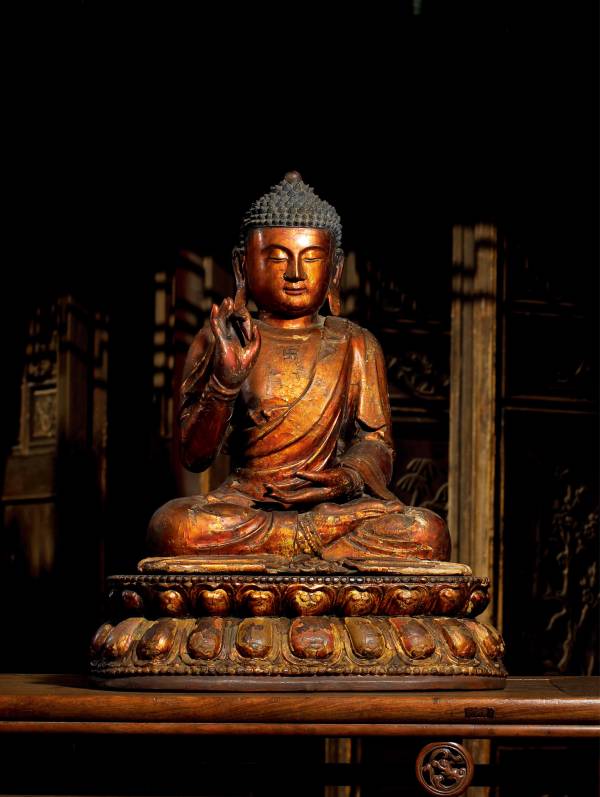 因此,摩尼宝珠被视为消灾、吉祥的象征,以祈求幸福平安,并解众生于贫苦,与药师佛之愿完全符合。佛像面容平静祥和,五官端庄,气质自然流露,使观者自心生敬意。身体挺拔端直,手足纤具饱满,尽显贤善之相。手掌向上置膝上,右手食指与拇指捻一枣核形药丸,是明清时期汉传药师佛标准化的造型。