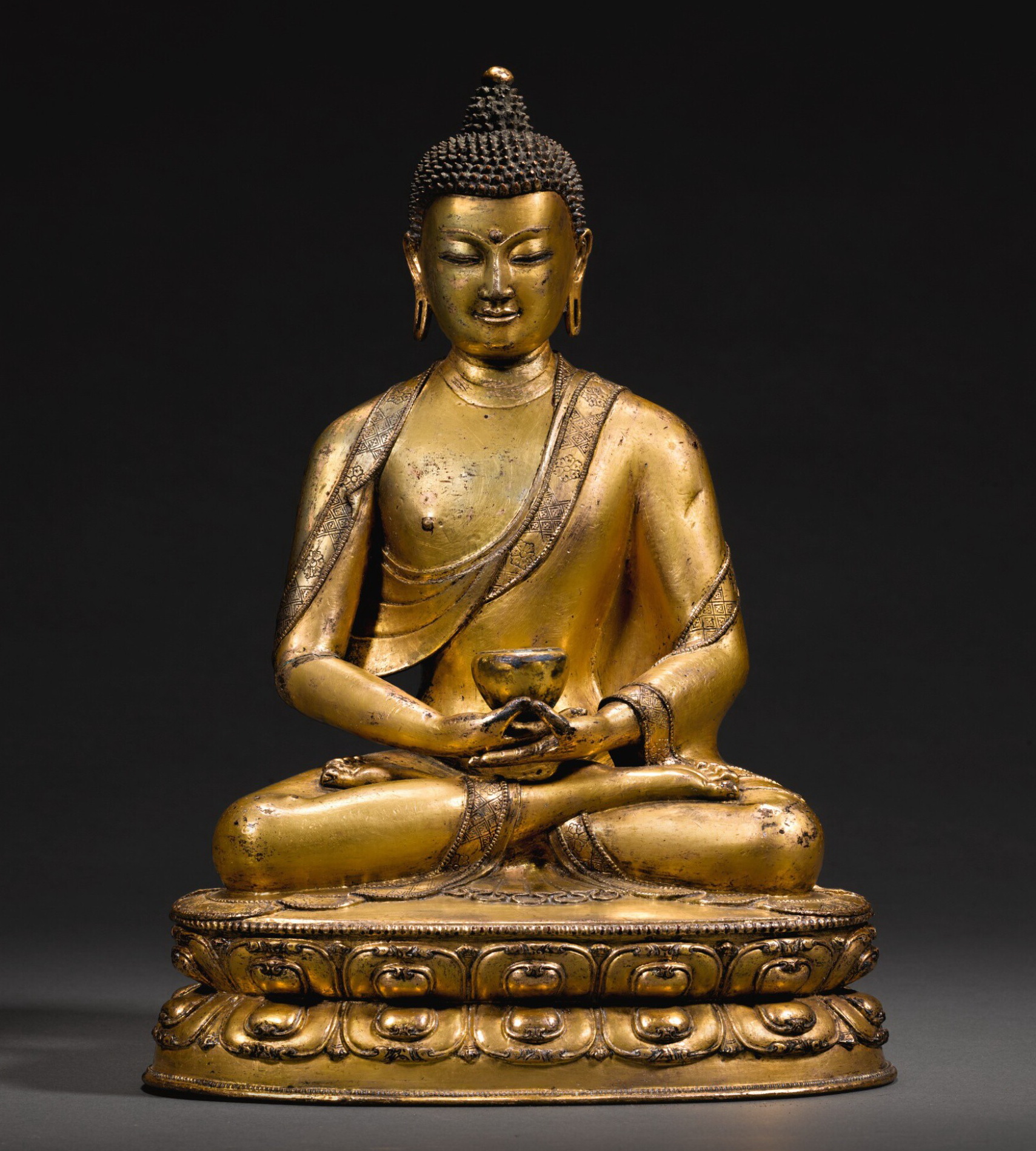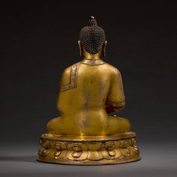 尺寸:高24.5cm 年代:15世纪 质地:铜鎏金 风格:西藏 来源:拍卖会 成交:44,100英镑(2020.11) 参阅:伦敦苏富比 鉴赏: 西藏地区制造, 仿内地风格