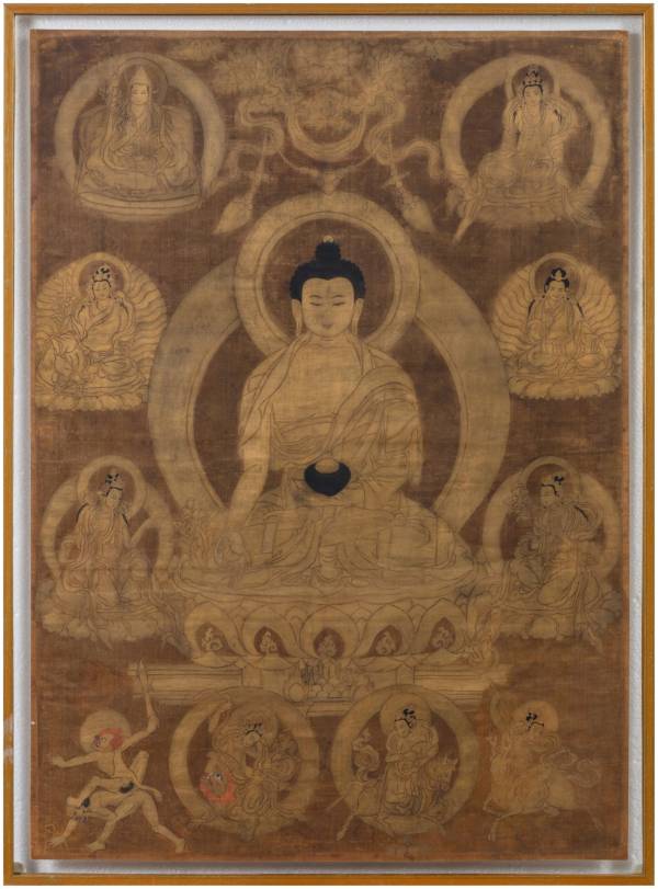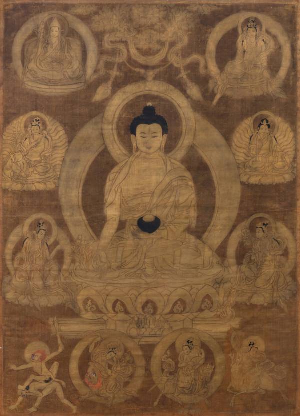 A rare silk thangka depicting Bhaisajyaguru, Tibet, 17th century, attributed to Choying Gyatso workshop