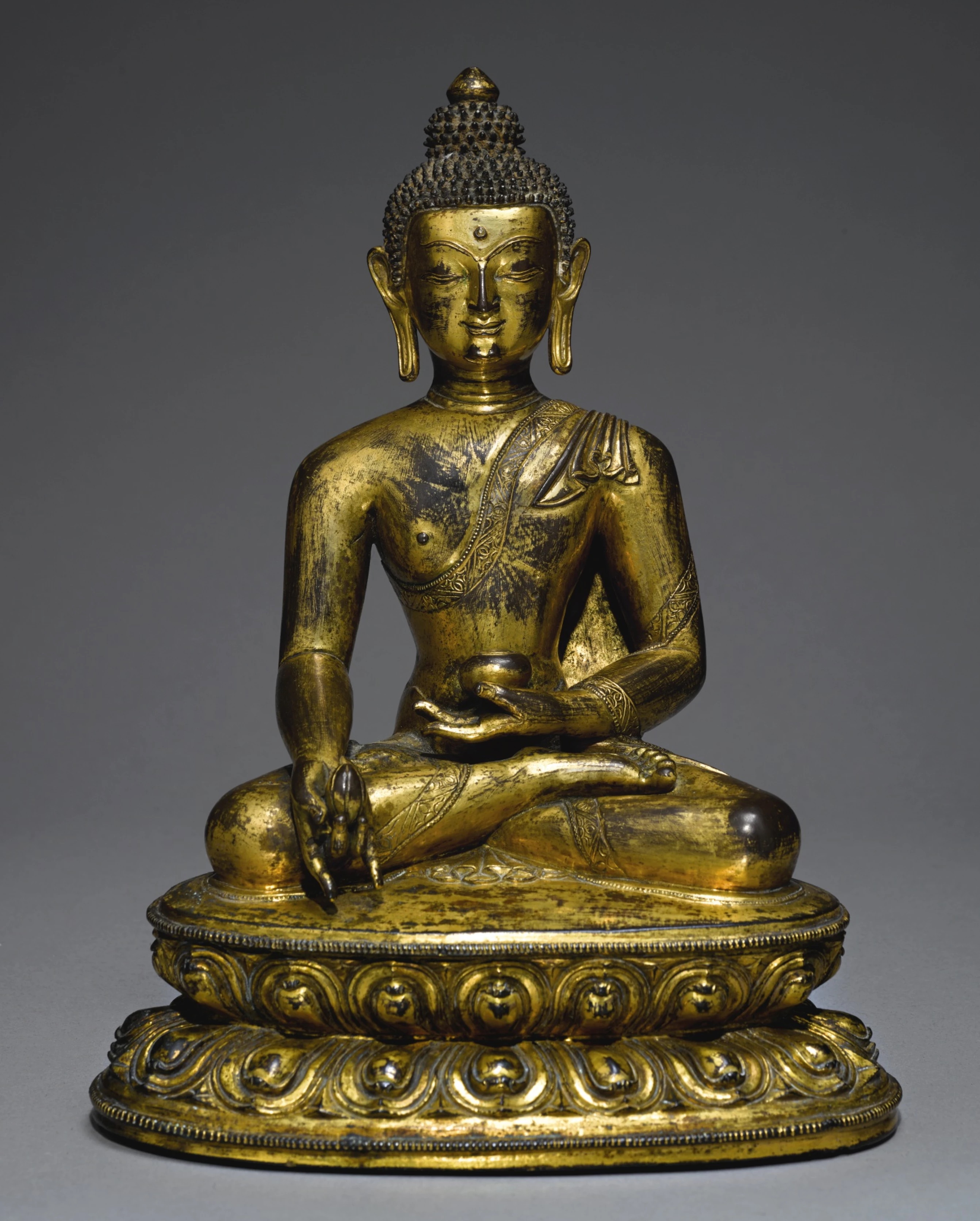 the Medicine Buddha seated in dhyanasana on a double lotus base with a beaded edge, with his left hand holding a bowl filled with amrita, his right hand holding a myrobalan fruit, the face serene with each feature composed and natural, the elongated ears slightly flaring over the shoulders, with upturned lips, a narrow and elongated nose underscored by the gentle and sinuous contours of the eyes and eyebrows, the delineated curls of the head with a tall and prominent ushnisha crowned with a bud, the body draped with a sanghti with an incised hem cascading into folds by the feet Himalayan Art Resources item no. 13636.