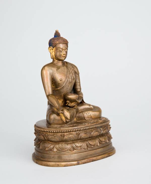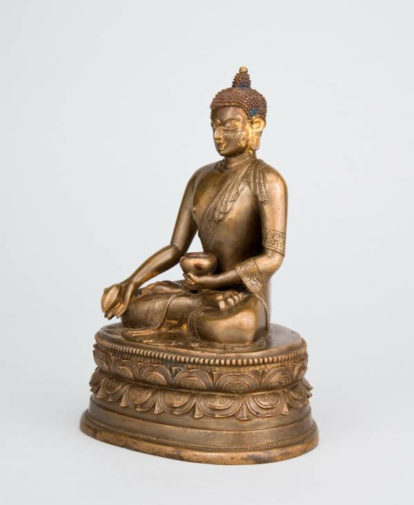An image of the Medicine Buddha is often found in the houses and offices of traditional Tibetan doctors who consider him the source of their knowledge and practice. The Medicine Buddha sits on a high lotus seat of double rows of lotus petals. Hedisplays the recognizable attributes of a buddha, but his implements distinguish him as the King of Medicine (Menla Gyelpo), as he is known in Tibetan, Himalayan, and Mongolian cultures. His left hand supports a bowl of nectar, and his right hand holdsa myrobalan fruit, which is considered a universal remedy in Tibetan medical traditions and one of the main ingredients in Tibetan medical compounds.Tibetan Buddhism was first introduced to Mongolia in the thirteenth century by Buddhist teachers who were patronized by the ruling elite of the Mongol Empire, such as Qubilai Khan (1215–1294), the grandson of Chingghis Khan who conquered and ruled China. Mongolians traditionally held shamanistic beliefs, but between the sixteenth and eighteenth centuries many incorporated Buddhism into their belief systems. Similarly, Tibetan medicine was integrated with the Mongolian indigenous healing practices and is widely practiced today.