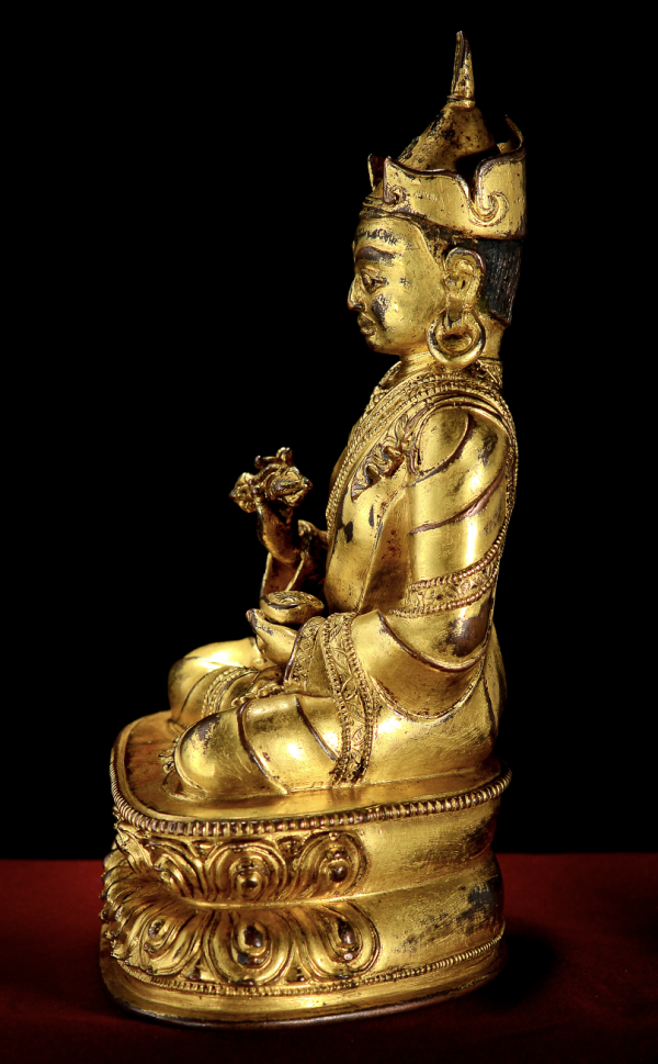 本尊造像通体鎏金,雍容华贵!莲花生大师头戴标志性的折沿帽,帽顶翎羽,帽前端饰有日月。从法帽边沿上云头纹和翎羽上分毫毕现的刻画就可以看出此尊造像的高级之处。大师额髻高广,鼻梁挺拔,五官刻画比例精准,开脸秀气,面容俊美,双目炯炯,面相庄严肃穆,为超然智慧的显现,也体现了匠师浑厚的写实功底!从大师略带稚气的开脸和如杏仁般的开脸,以及微微嗔怒的表情上可以看出,此尊造像在在艺术风格上深受尼泊尔造像的影响。
