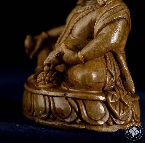 饱满圆雕!!大气十足!!艺术性一流!!此尊黄财神一面二臂,开脸十分标准,面庞丰腴,五官饱满精致,整观相貌威仪!财神身形饱满大气,头顶精美的国王式发冠加以装饰,坦胸露腹,肚大腰圆,双耳挂珰,耳际伴有扇形冠结横出,四肢饰有钏,双臂右手持布拉噶如意宝,象征宝光普照十方,增添众生的福报;左手臂夹着吐宝鼠,肥硕的老鼠口吐无尽宝珠,好似用之不尽,取之不竭,洋洋洒洒的堆满了整个莲台,在藏传佛教的教义里财神的吐宝鼠吐出的珍宝越多,则证明此尊财神的缘起越好,能够为持有者带来更多的财富!黄财神左腿横盘、右脚伸,以如意姿安坐于莲花宝座之上,姿态简单而富有动感!其下低矮稳固的莲花宝座,莲瓣宽大饱满,整观可谓气韵俱佳!如此小巧且雕工如此细致有韵味的黄财神简直少之又少,而现在藏家又越来越关注小且精、小且美的藏品,像本尊黄石雕黄财神更是比金铜佛像罕见的多,他的不可复制的工艺性,材质的不易保存性,精美的完整性,其实存世量真的非常少,特别是石雕的艺术价值在国外更是远远高于金铜造像!历经时代的沉淀,更是决定了此尊造像无可比拟的价值!