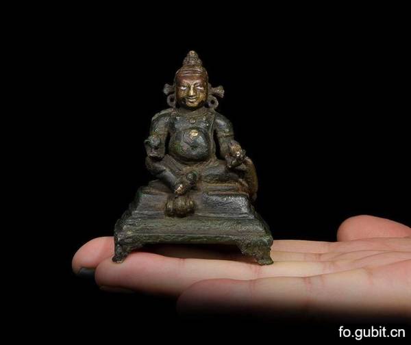 造像头顶高发髻,宝珠顶严,高额丰颐,双目含笑圆睁,两眼罕见嵌银,高鼻厚唇,五官具印度人特点。上身袒露,项挂一串精美的花环,项链,手镯,臂钏严饰。左手握吐宝鼠,右手持摩尼宝,游戏坐姿的右足踩宝瓶,坐于非常少见的方莲台之上,整尊造型端庄,工艺简练且精致,合金铜质久经岁月,显得古朴润泽,为典型的早期世纪东北印度帕拉造像,同时又是黄财神题材,真是非常罕见的一件随身佛。