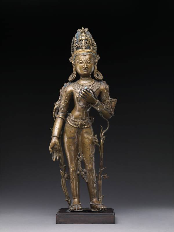 This Padmapani descends from a series of eleventh-century bodhisattva icons produced under the patronage of the Guge kingdom. It belongs to a larger tradition of metal bodhisattva icons made in western and central Tibetan workshops under both Kashmiri and Indian Pala dynasty influences. The inlaid silver for the eyes and copper for the lips, and the jewelry details, reflect Tibetan responses to Pala models. A softness to the anatomy points to its twelfth-century date, as do the crown, ear ornaments, and engraved textile designs on the waist cloth.