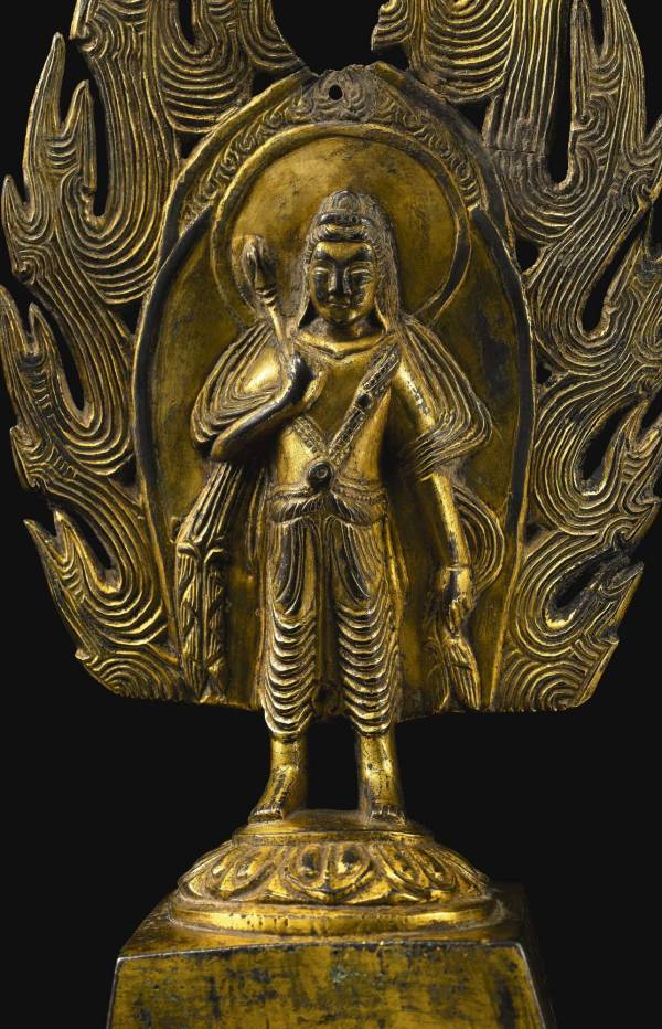 The closest published example of this unusually large size, cast with similar powerful flaming mandorla, is an earlier gilt-bronze figure of Padmapani, dated to 453, in the Freer Gallery of Art, accession number F1909.266. Compare also a figure of standing Sakyamuni, dated to 475, unearthed in Mengcun, Mancheng county, Hebei in 1967, and now preserved in Hebei Provincial Museum, illustrated in Zhongguo wenwu jinghua daquan. Qingtong Juan, Taipei, 1993, p. 347, pl. 1249 and in Saburo Matsubara, Chugoku Bukkyo Choukuku Shi Ron/The Path of Chinese Buddhist Sculpture, Tokyo, 1995, vol. I., pl. 35b.