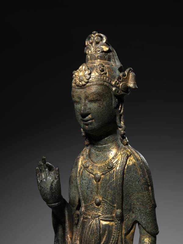 This bodhisattva holds his hand palm forward, in a gesture that tells followers not to fear. In his other hand he carries a bottle that holds the elixir of immortality.