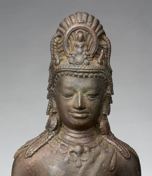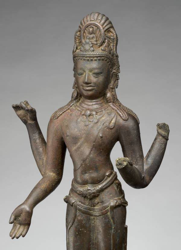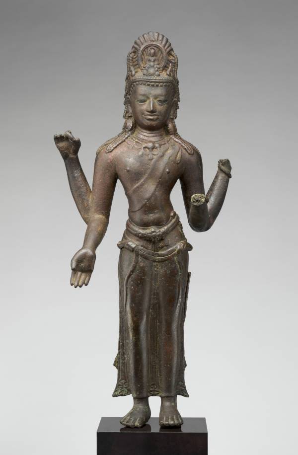 This four-armed Avalokiteshvara exemplifies the finest qualities associated with the pan-Asian cult of the savior bodhisattva. Through its grace and humanism, the work embodies the qualities of compassion central to Buddhist ethics. It may have been made in Sumatra or in the Malay Peninsula, regions linked by commercial activity in which religious imagery could readily circulate. Chinese pilgrim sources tell of major monasteries that prospered in both areas.