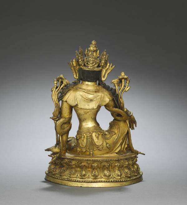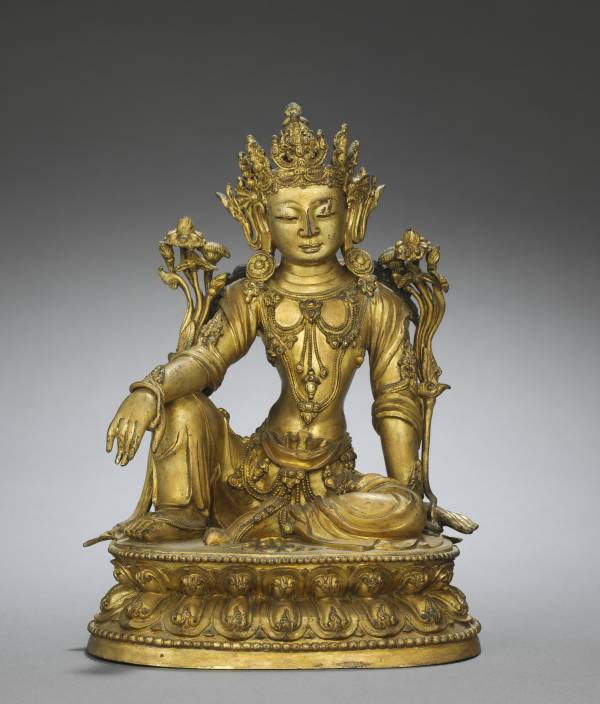 A heavily jeweled Guanyin sits in the posture of royal ease on a double-lotus throne. Also known as Avalokitesvara or the Bodhisattava of Compassion, Guanyin postponed achieving enlightenment in order to assist all who cry out for help. This made Guanyin a very popular devotional figure for Buddhists. This gilt bronze's size suggests that it could have been placed on a private altar or shrine for personal devotion.