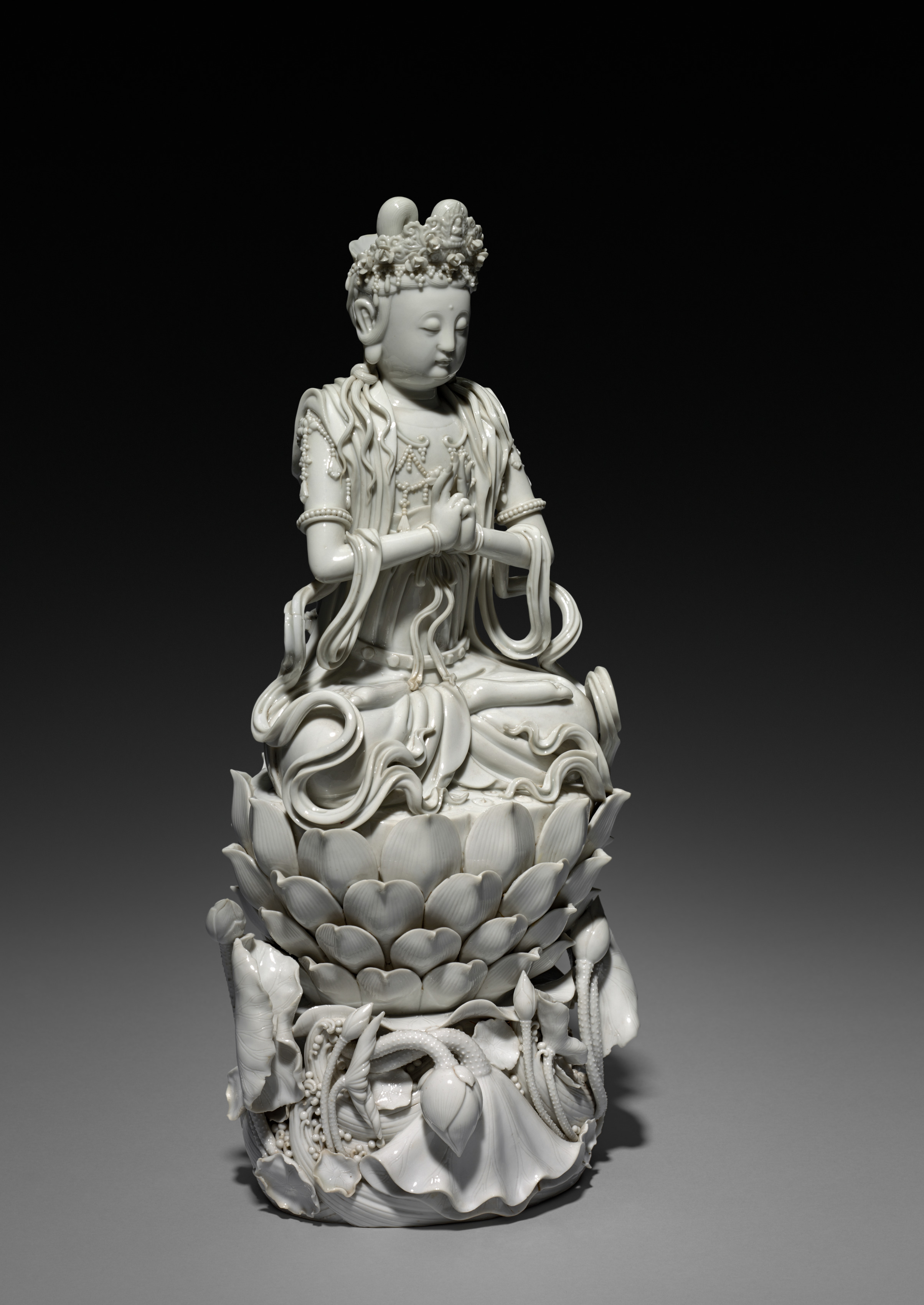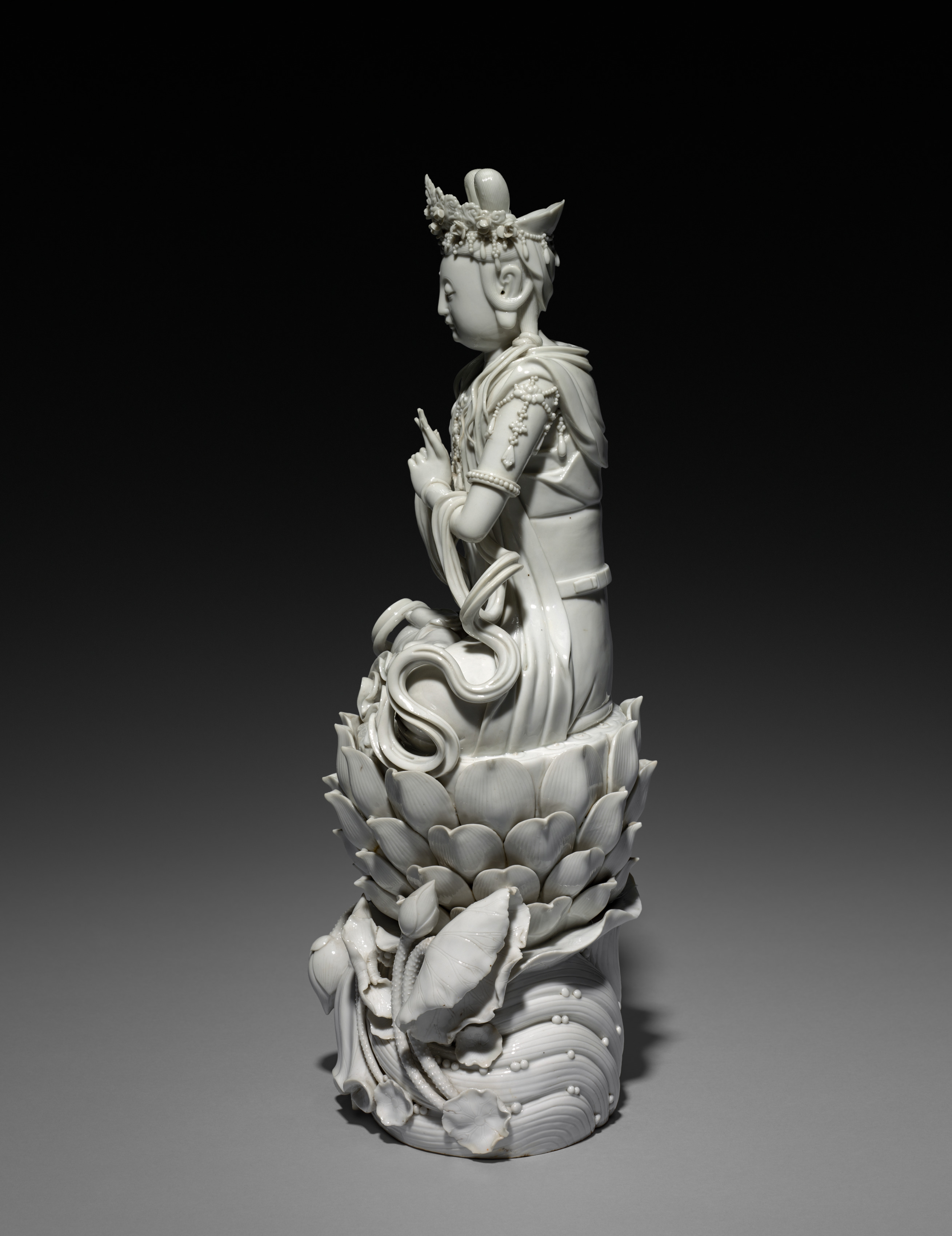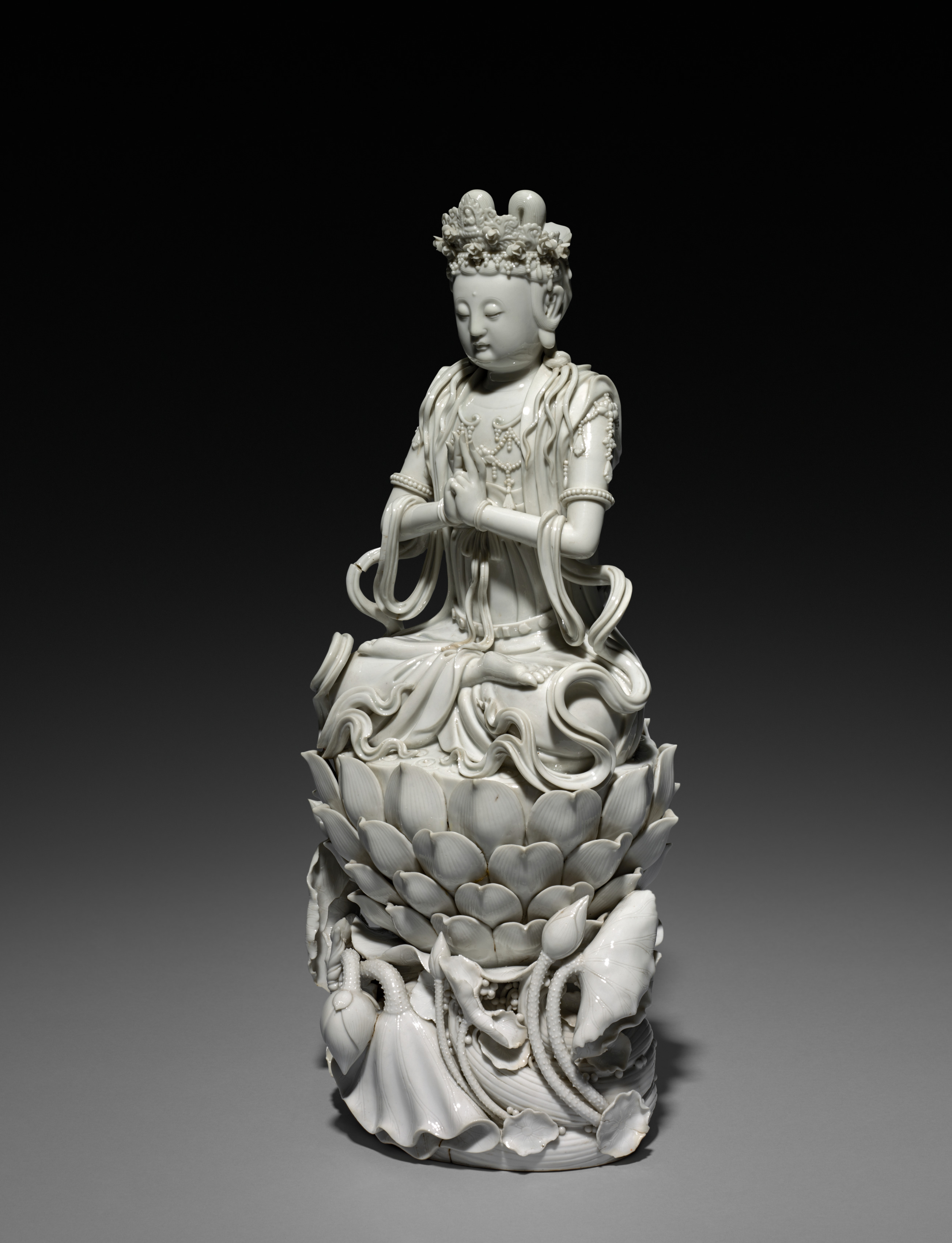 Guanyin, the Buddhist bodhisattva of infinite compassion (Avalokiteshvara in Sanskrit), is the most revered enlightened being in East Asia. The bodhisattva perceives all beings in need of help and reveals himself in many forms. Here, his elaborate lotus pedestal rests on the crest of surging waves, identifying him as Guanyin of the South Seas. The Dehua kilns in Fujian province in southern China produced white porcelain figures for both the domestic and export markets. In China, such a figure may have furnished a house altar or a temple.