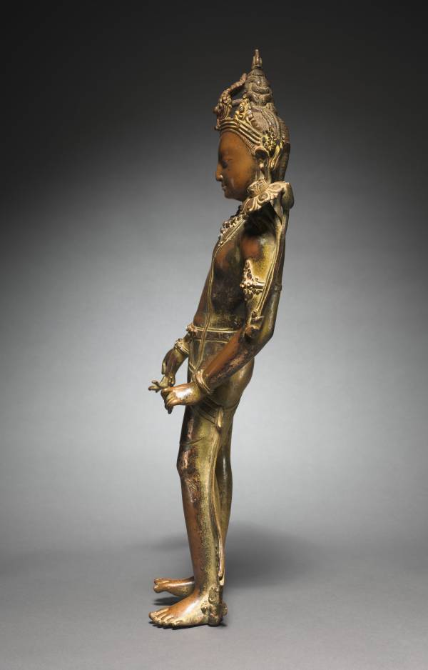 All bodhisattvas wear royal garments and jewels, in reference to the historical Buddha’s early life as a prince, prior to his achievement of enlightenment through meditations in the forest. In the center of his crown is the tiny seated image of the meditating Buddha Amitabha that identifies this figure as Avalokitesvara specifically.
