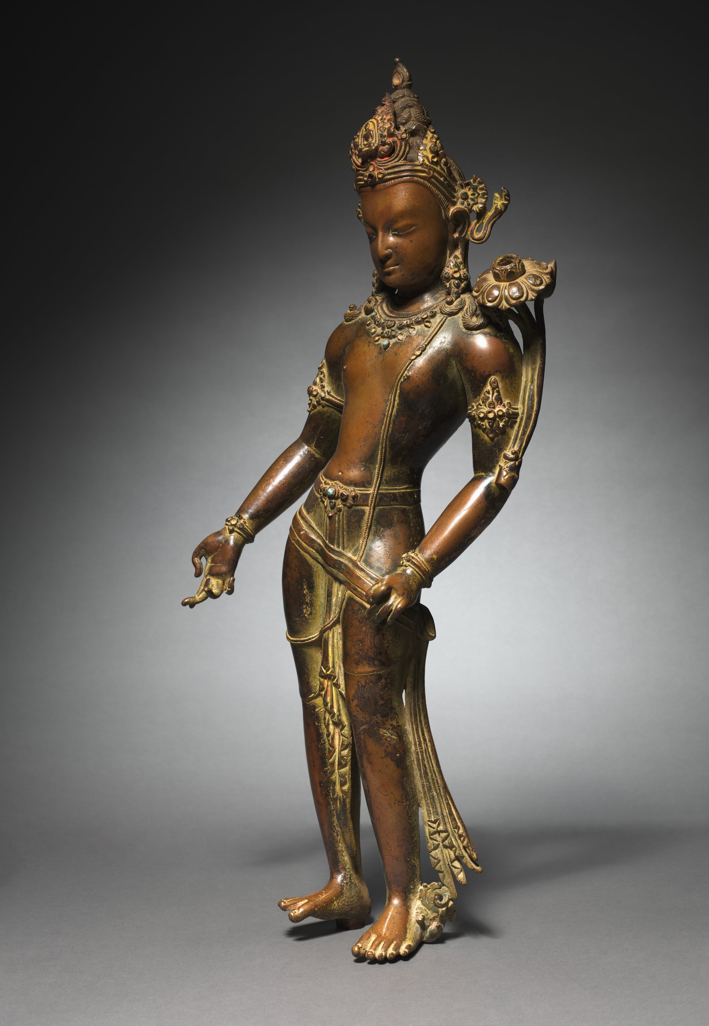 Venerated by Buddhists across the world as the perfect embodiment of compassion for all beings, this bodhisattva-a being only one stage away from complete enlightenment-holds his right hand out gently in the gesture of gift-giving. In his left hand, he once grasped the stem of a lotus flower that blossoms over his left shoulder, indicative of the abundant benefits that result from acts of loving kindness.