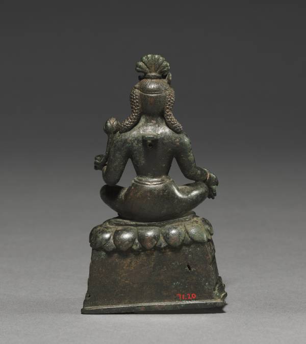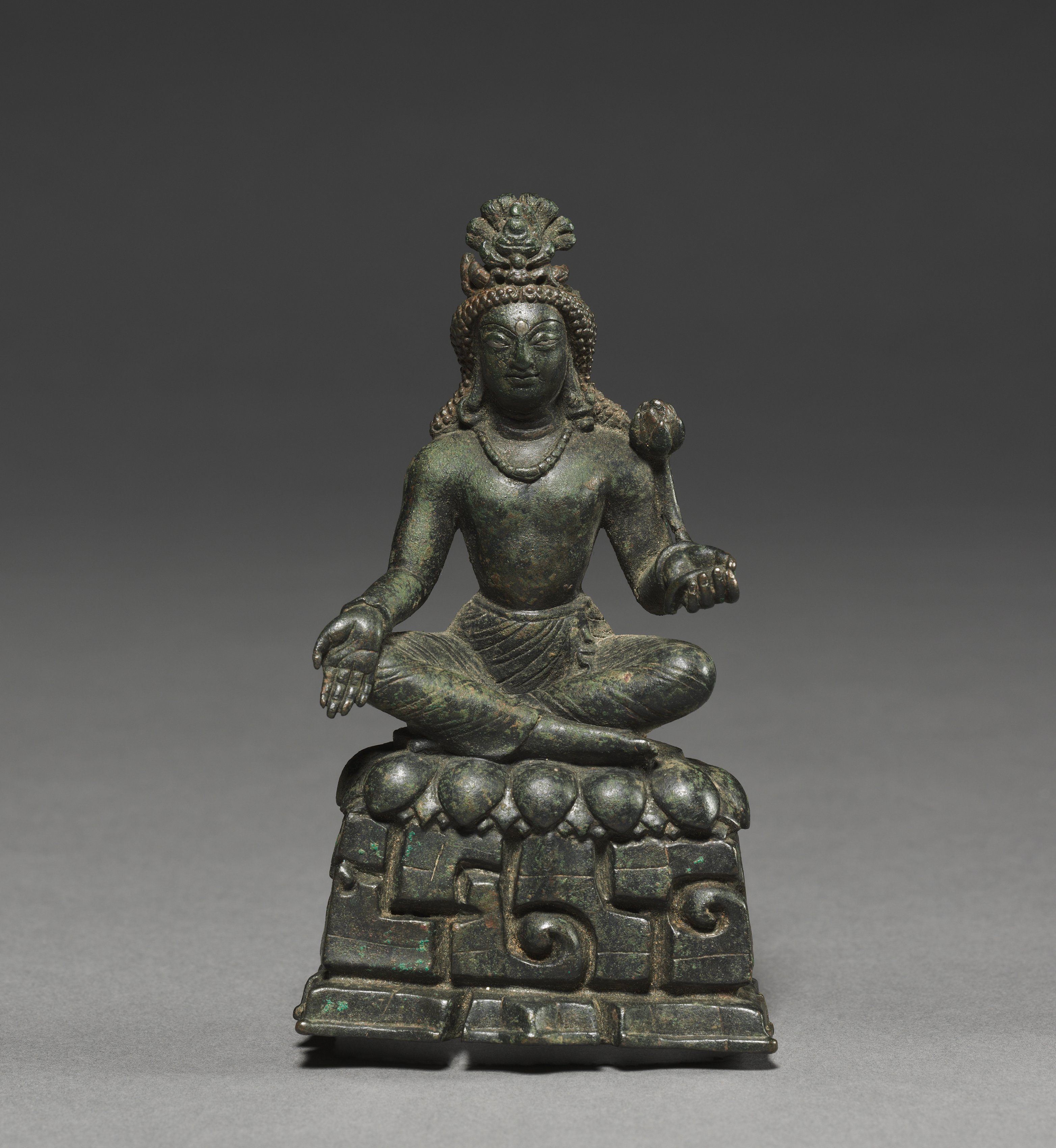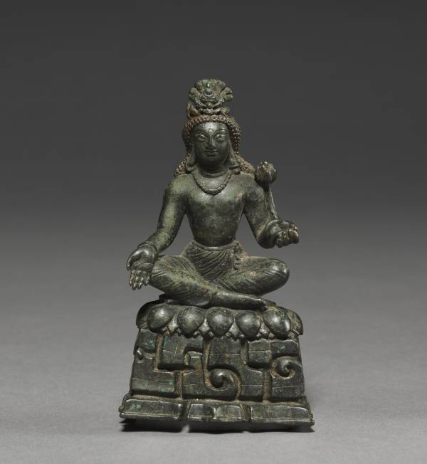 Though diminutive, this image conveys a monumental power through the intense expression particular to Kashmiri art. He sits alert in yogic concentration on a lotus pedestal that exists miraculously in a rocky wilderness. His left hand holds the stem of a lotus flower—the main attribute of this bodhisattva of compassion. His generously sized right hand with fleshy palm is in the gift-giving gesture. The tiny figure of Amitabha, the Buddha who sits in meditation in his crown, identifies the image as Avalokiteshvara.