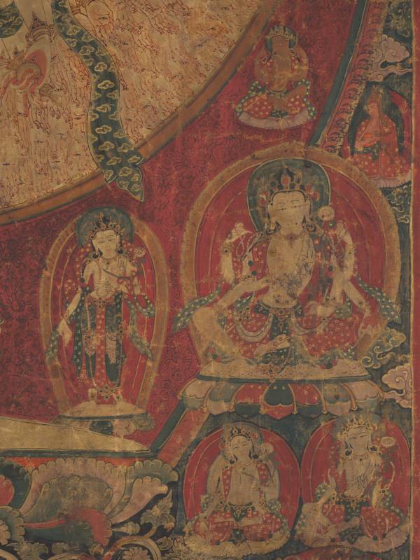 One thousand arms surround the central figure like a radiating halo. Each hand has an eye in the palm to see the suffering of all beings, generating the sense of compassion that this figure embodies. The special form of the central image of the bodhisattva Avalokiteshvara derives from the mystic vision of a nun named Gelongma Palmo, who was born a Kashmiri princess, but prayed for leprosy to avoid having to marry and became an accomplished nun. While meditating in a cave, she achieved this vision of 11-headed, 1,000-armed Avalokiteshvara, who cured her leprosy and guided her on the path to enlightenment.