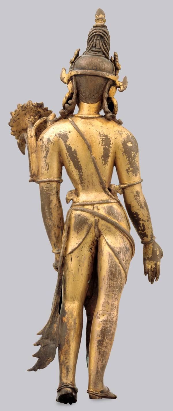 The Bodhisattva of Compassion, Avalokiteshvara, is one of the most popular deities in Nepal, where 108 forms of him are known. In his simplest form, extending his right hand in the gesture of giving and holding the stalk of a lotus (now broken) in his left, he is often called Padmapani, or “Lotus-in-Hand.”This sculpture is remarkable for its fluid simplicity of form, graceful proportions, and elegant jewelry. The subtle modeling of the body contrasts with the voluminous pointed dress- and scarf-ends and the large, slim-petaled lotus blossom. The reddish tone of the metal where the gilding has worn away indicates a high copper content, which is typical of Nepalese sculpture.
