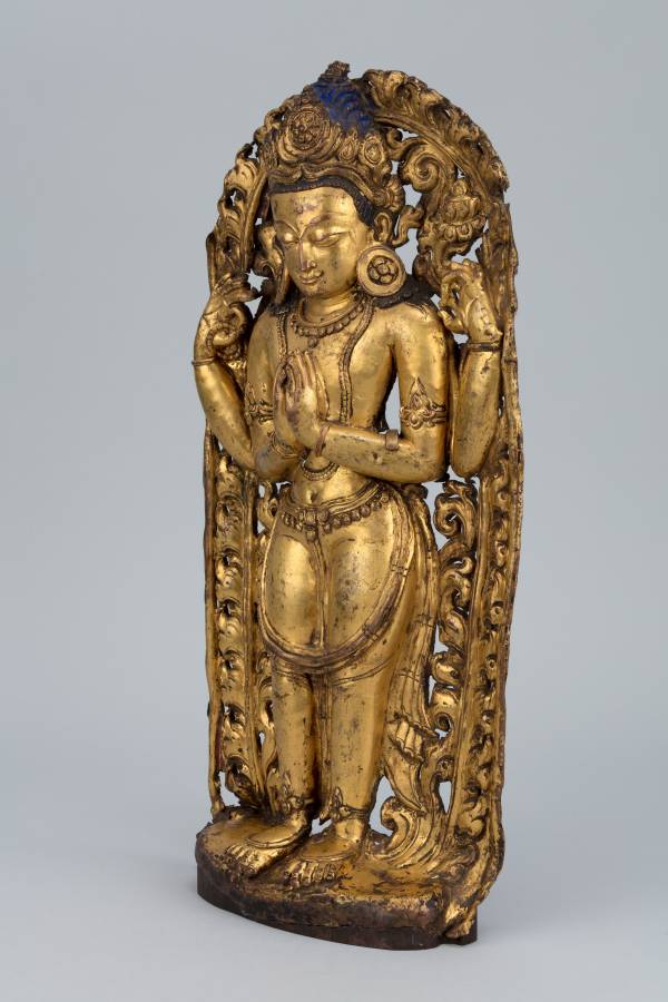 尺寸:16 1/8 × 6 1/2 × 2 7/8 in 年代:17世纪 质地:铜鎏金 锤揲工艺 风格:尼泊尔 来源:美国鲁宾艺术博物馆 参阅:外部链接 鉴赏: