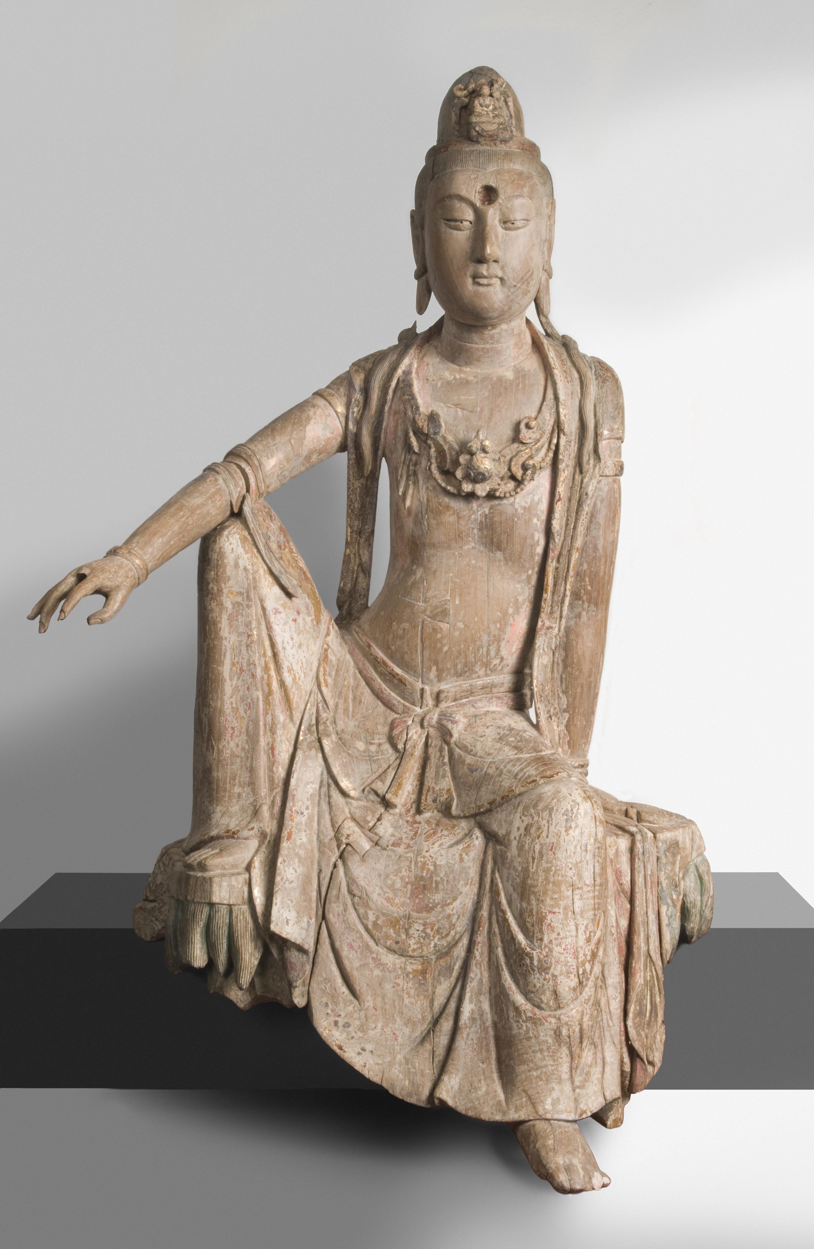 This sculpture, with its relaxed pose and serene expression, makes it is easy to understand why Guanyin, the Bodhisattva of Compassion, was one of the most popular and widely worshiped Buddhist deities in China. As with other bodhisattvas, Guanyin delayed her own enlightenment in order to help others.