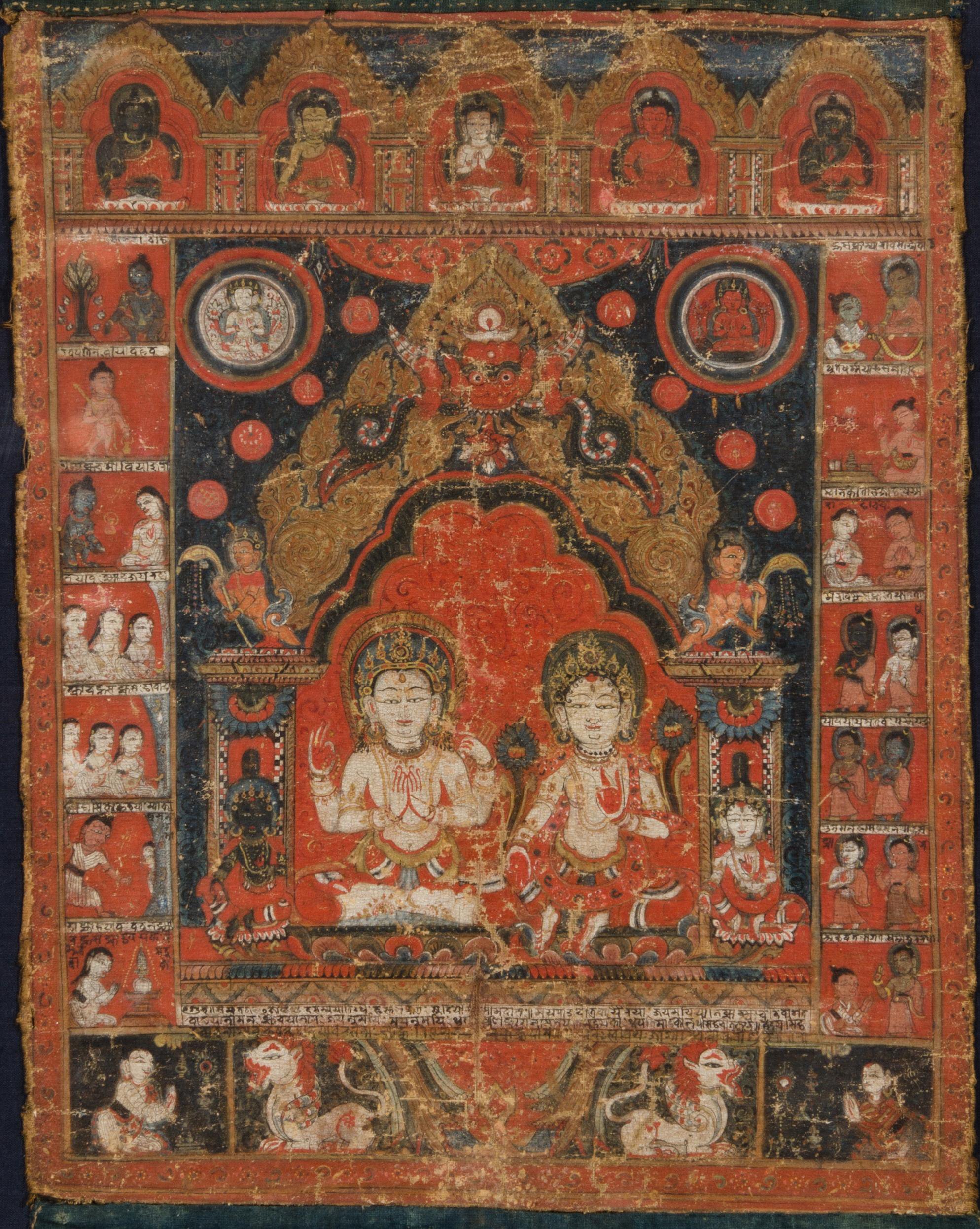 The central deities in this painting wear skirt styles distinctive of the Malla period. Festive red makeup colors the palms of their hands and feet, and the foreheads of all the women display the red tikka powder that distinguishes married Newar women even today. The bodhisattvas sit beneath a golden torana (arch), above which rest the heads of the Five Buddha Families. The colorful checkerboard patterns that edge the torana columns are also a stylistic feature of the Malla period; the painting’s inscription provides the year in which it was made.