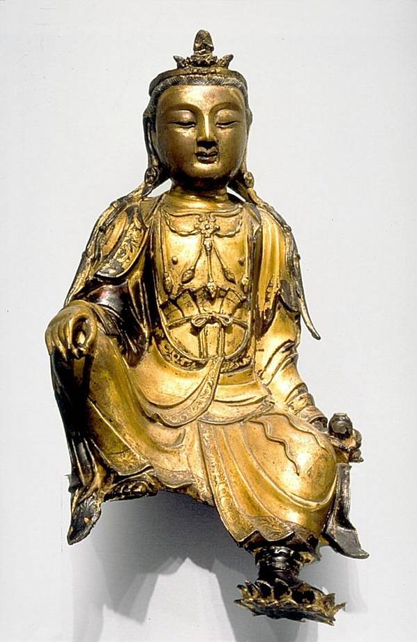 尺寸:H. 51 cm x W. 27 cm x D. 20.3 cm 年代:明代 质地:铜鎏金 风格:中原 来源:旧金山亚洲艺术博物馆 参阅:外部链接 鉴赏: Seated bodhisattva Avalokiteshvara (Guanyin) China