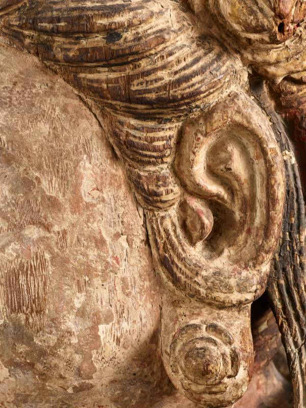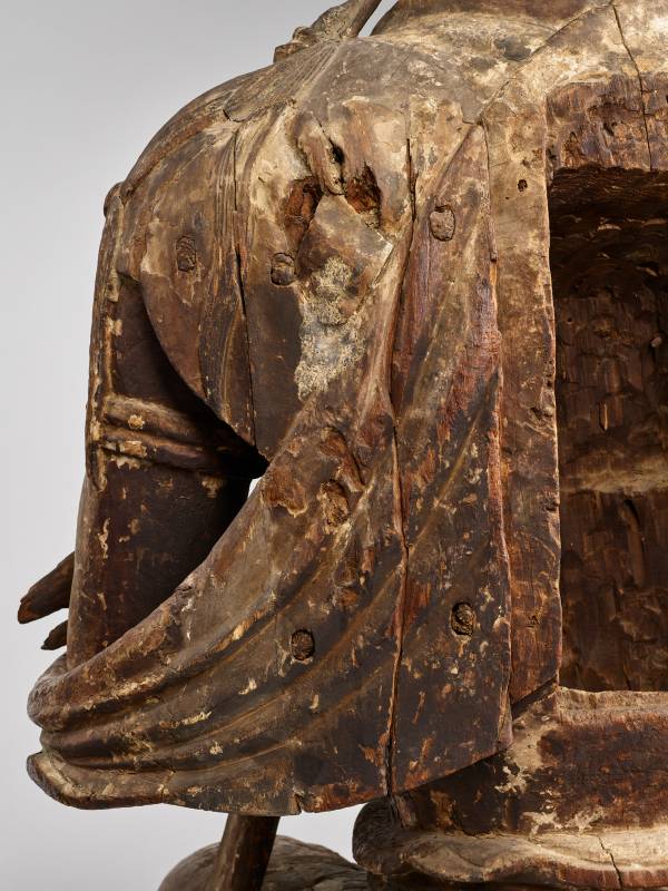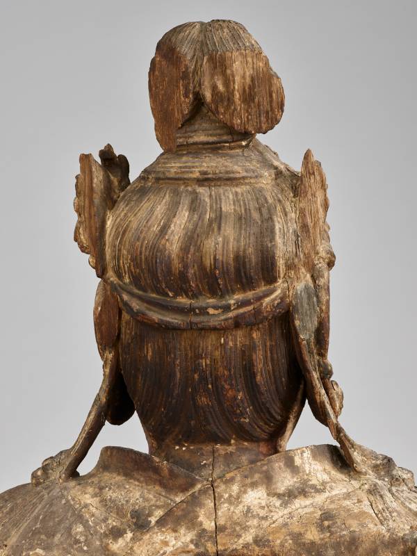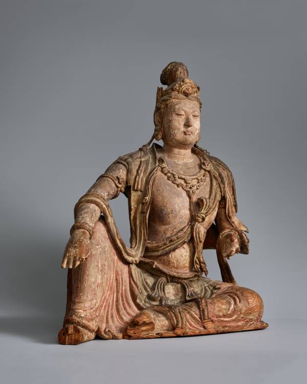 The finest sculptural works of the Song dynasty were carved out of wood and covered with gesso, pigments, and gold. Here, Avalokiteshvara is dressed as an Indian prince in a fluid garment with crossed sashes, scarves, and a necklace on his bare chest. He rests one hand on his knee and lifts the other in a gift-granting gesture. Showing a confident calmness, this deity fluidly presents his mercy over the suffering of humans and efficaciously consoles the souls of his devotees.