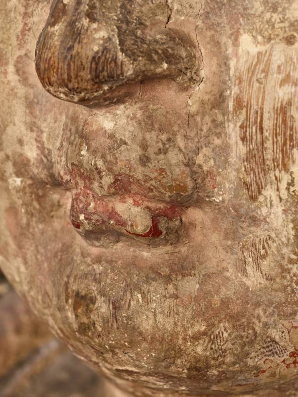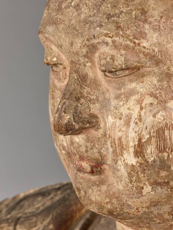 This statue may once have sat on a rocky base in the altar of a monastery, similar to the one in the photo. Many Chinese Buddhist monasteries of the eleventh century contained richly illustrated wall paintings and painted statues. The integration of architecture, wall painting, and sculpture into the visual and ceremonial programs of monasteries characterized a new height of Buddhist art in middle-period China.