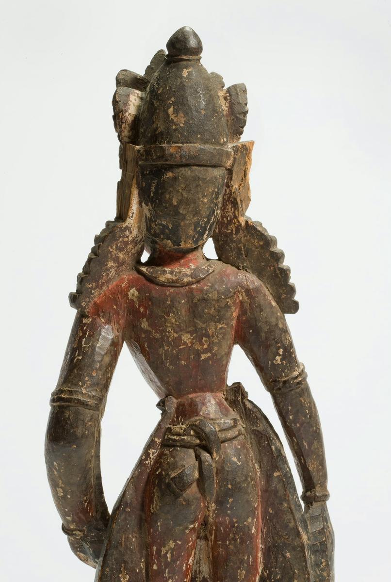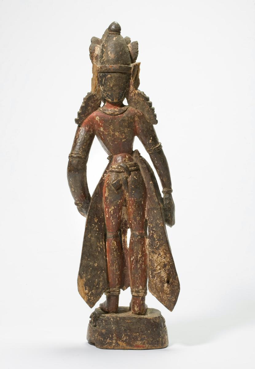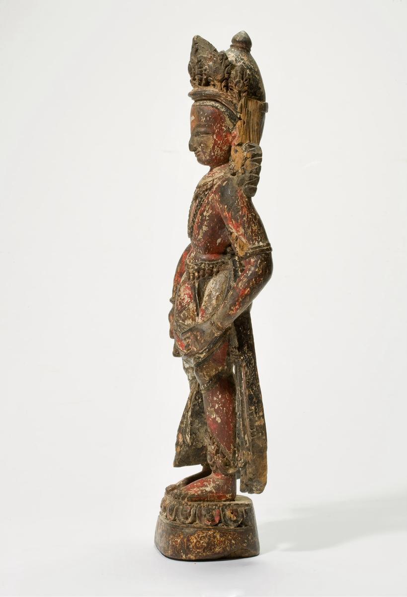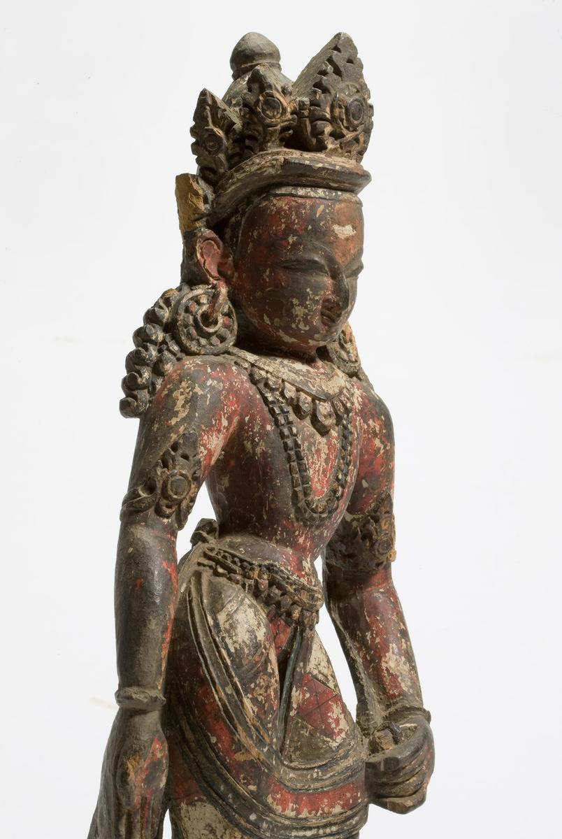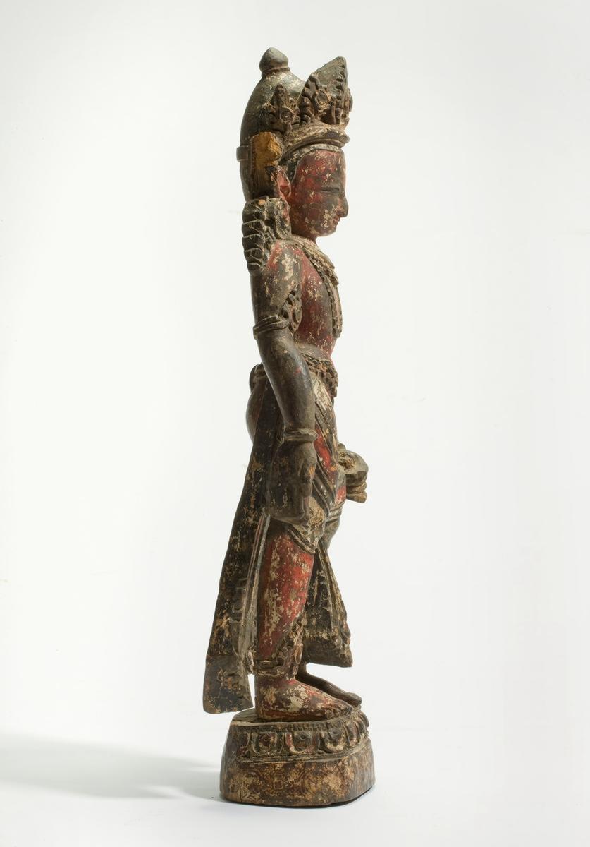 The youthful figure, wearing a five-leaf crown and a tight-fitting garment with elaborate pleats, stands with a slight sway on a lotus pedestal. His right hand makes the gesture of bestowing gifts, and his left, resting on his side, once held an attribute. Typical of Nepalese sculpture, the god is depicted as a young and handsome figure with a smiling face. The sculpture was once gessoedand painted.