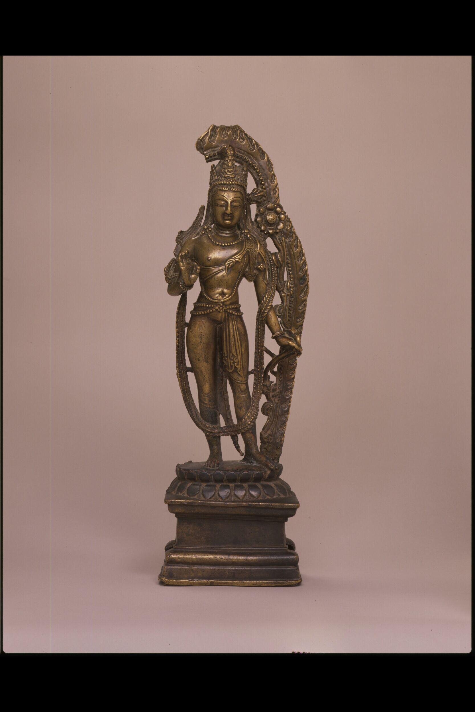 This bronze bears a contemporary inscription recording that it was dedicated during the reign of Queen Didda, who is known to have ruled Kashmir between 980 and 1003 AD.