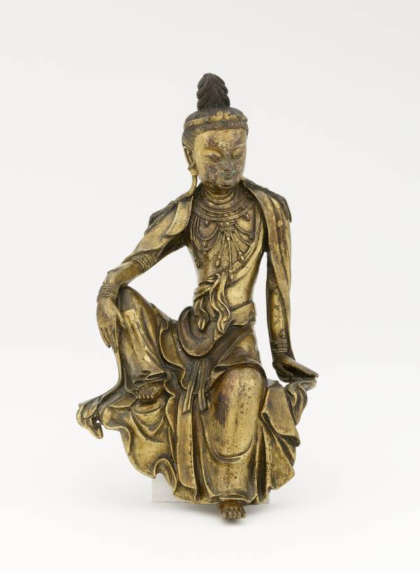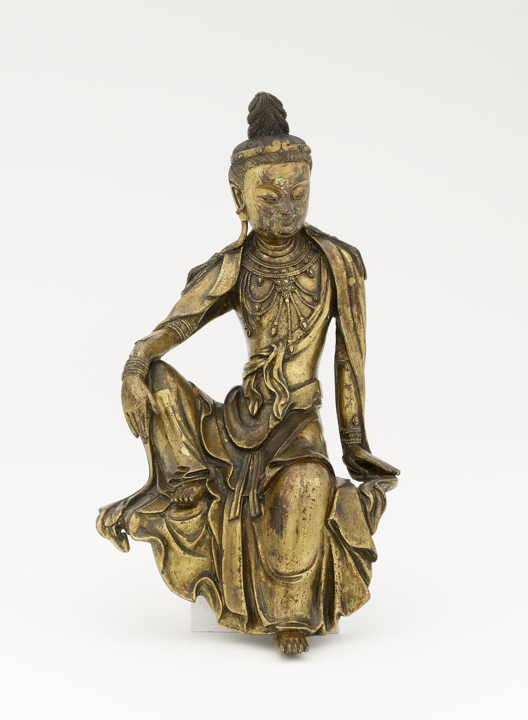 The position in which this Avalokiteśvara is seated, a variant form of ‘rājalīlāsana’ (royal ease), was a popular sculptural formula between the 10th and 14th centuries. The earliest datable Chinese Bodhisattva thus seated is a finely cast gilt bronze made under the 10th-century Wu-Yue kingdom in east China, excavated from the Wanfo pagoda, Jinhua, Zhejiang province; its distinctive halo, a plain band with three flaming cusps, quite alien to contemporary Chinese styles, supports the supposition that this iconography was a post-Tang import.