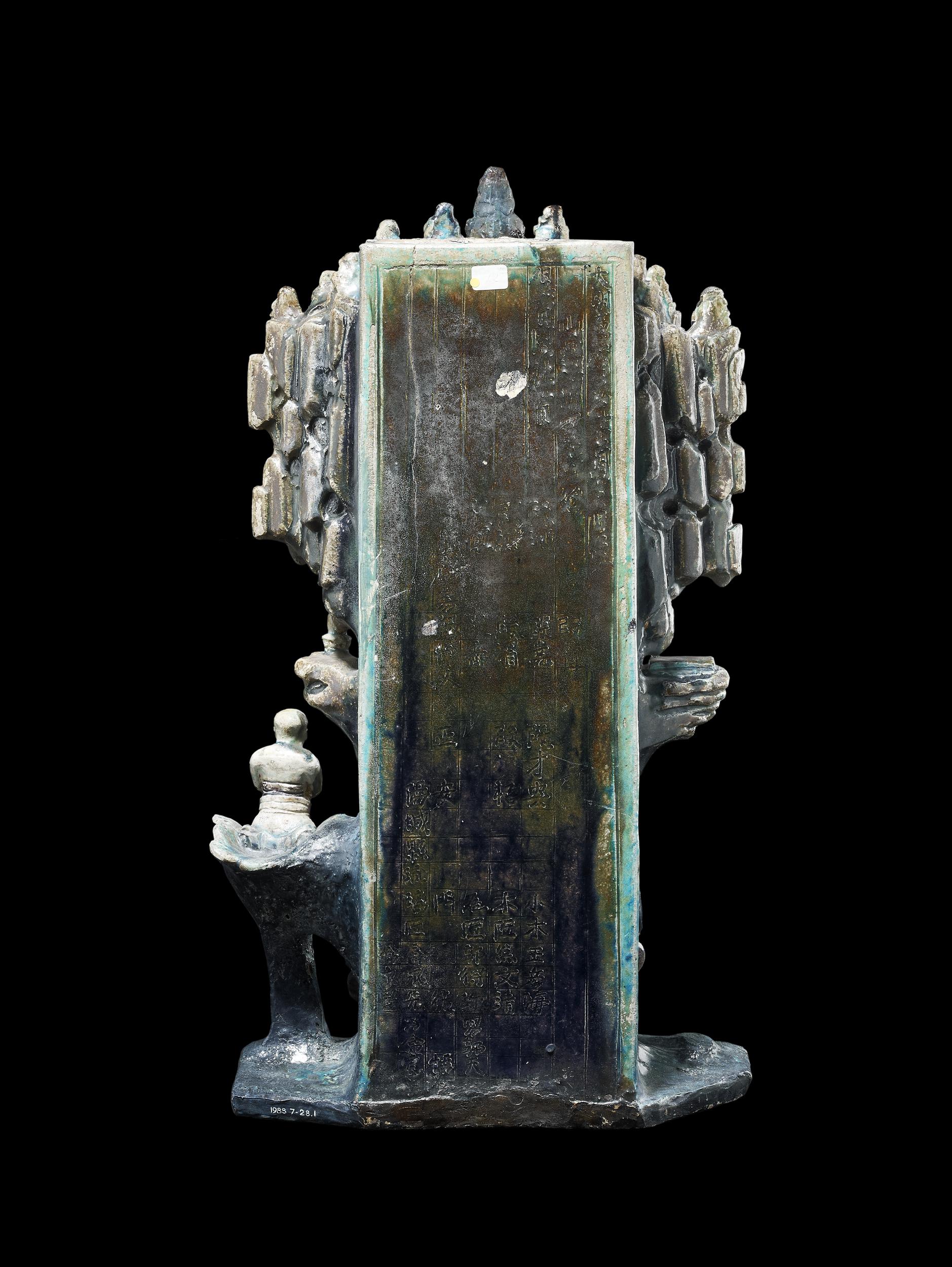 Architectural fitting in the form of the Bodhisattva Guanyin in a grotto with 'fahua'-palette glazes. This is a truly remarkable documentary piece. An architectural fitting, it represents the Bodhisattva Guanyin seated at ease on a lotus seed pod in a grotto in a lotus pond. She is dressed in flowing robes, jewellery and a crown. Beside her is a Buddhist disciple with bare torso and his hands held together in prayer, kneeling on a lotus leaf. On either side of Guanyin on rocky outcrops are her attributes: a willow branch in a vase and a sutra on a cloth. Above her head is an overhanging rock with three relief characters in roundels which read, from right to left: 'Lian chi hui' [Festival of the Lotus Pond]. Attached to the back of the sculpture is a hollow rectangular tube which is pierced through about one third of the way down. The back is scored with a grid of guide lines for calligraphy and is incised beneath a layered turquoise and dark blue glaze. This inscription is hard to decipher as the glaze has almost obscured certain characters and the architectural fitting is repaired around the base, concealing some of the bottom line of characters.