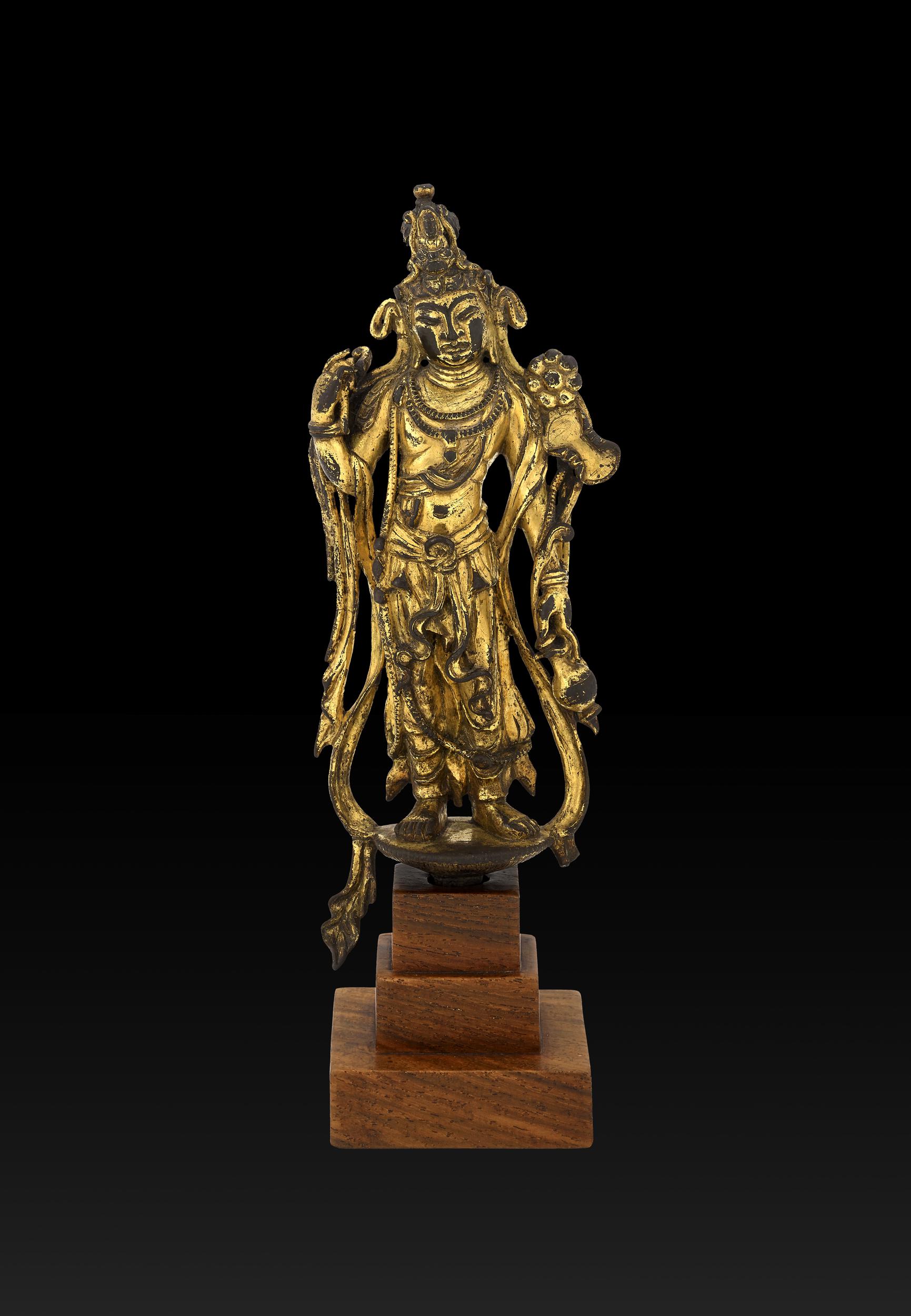 Central Asian and Indian Gupta styles continued to influence Chinese Buddhist art into the Tang, and against the secure and prosperous climate of the 7th and early 8th centuries regional and metropolitan Buddhist styles began to converge. The swirling scarves and sensitively modelled torso of this bronze can be matched with Bodhisattva images seen in the paintings (murals and banners) and sculpture of Dunhuang and Bingling si, both in Gansu province. Metropolitan versions in stone survive at several major sites; amongst those which best reflect 'high Tang' styles are stone images at Tianlong shan, Shanxi province, and in the environs of Xi'an (the Tang capital Chang'an), Shaanxi province.