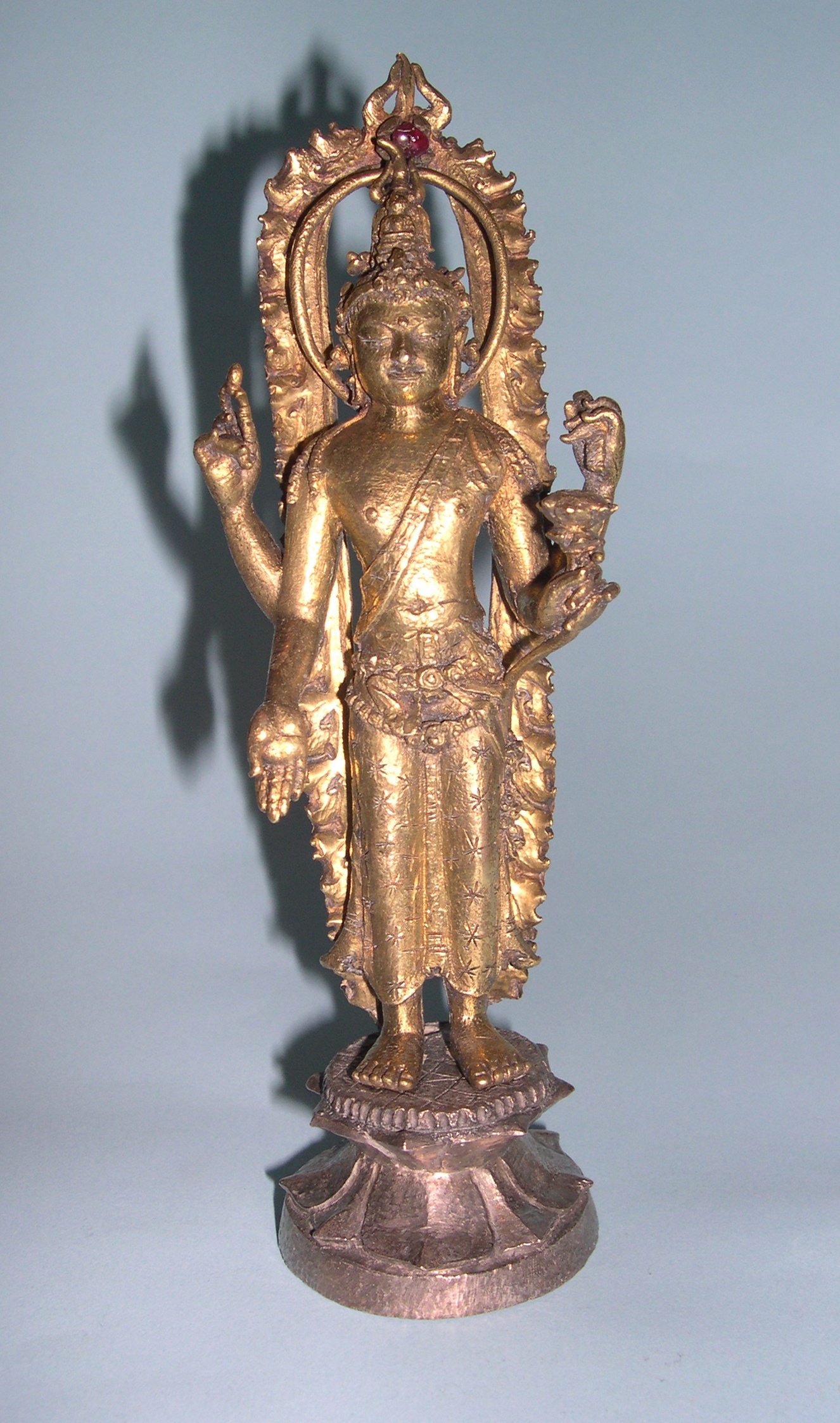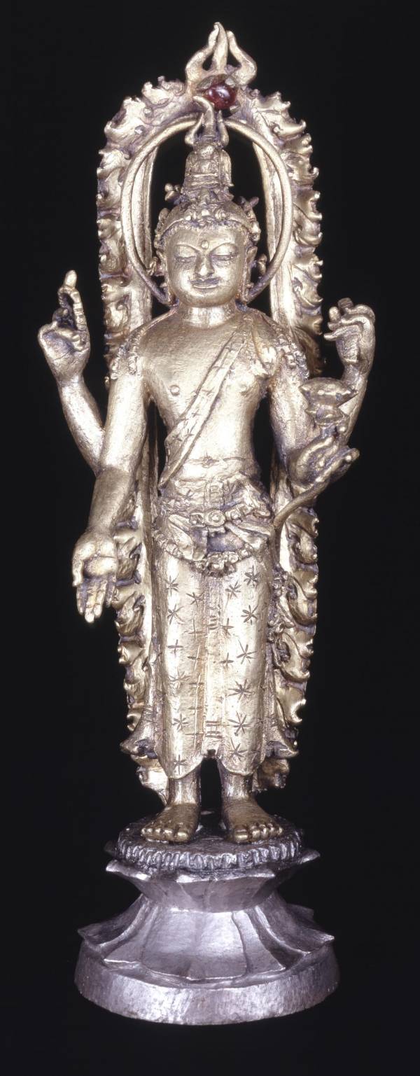 Figure of the bodhisattva Avalokitesvara standing on a lotus plinth with a plain ring halo and a flamed surround. Made of gold with a bronze base and a ruby in the surround. Cast.