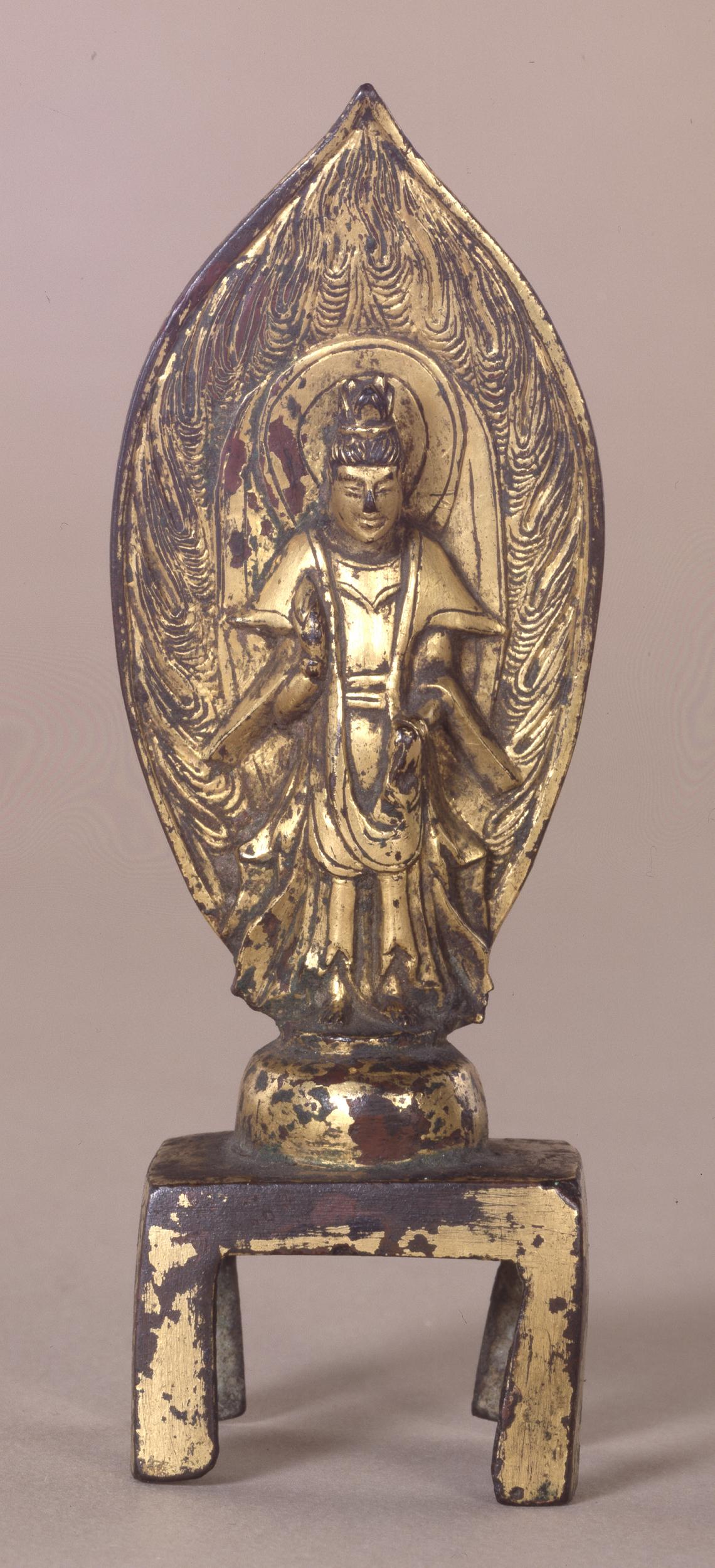 Figure of Padmapāṇi; standing on a stand with a back plate; wearing a robe with the flared edges of robes and scarves pulled out into tapering points. Inscribed. Made of gilded cast bronze.