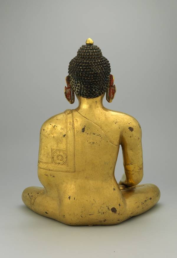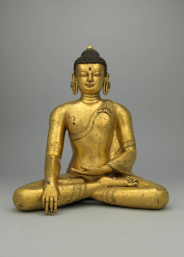 Artistic centers developed in a number of kingdoms along the Himalayan range, including the Khasa Malla kingdom of northwestern Nepal, to which this fine image of the Buddha can be attributed. The sculpture is sturdy and has a proportionally large head with a low forehead and broad shoulders. Characteristic of the Khasa Malla period are the beak-like nose and the downcast eyes widening at the sides. The details of his monastic robe, the ornamented hem across the chest and the tail end on the shoulder, are quite stylized. He wears upturned earrings inlaid with turquoise, an unusual feature of the Khasa Malla aesthetic.