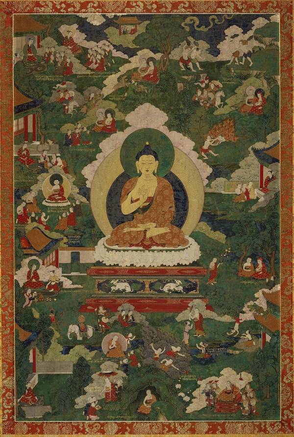 Gold-skinned Shakyamuni sits cross-legged on a lotus on a throne. His right hand is in the teaching gesture, his left is in dhyana mudra. He is surrounded on all sides by vignettes, apparently scenes from his life or past lives, including preaching scenes, a hell scene, and someone being pushed from a roof, all within a verdant landscape.