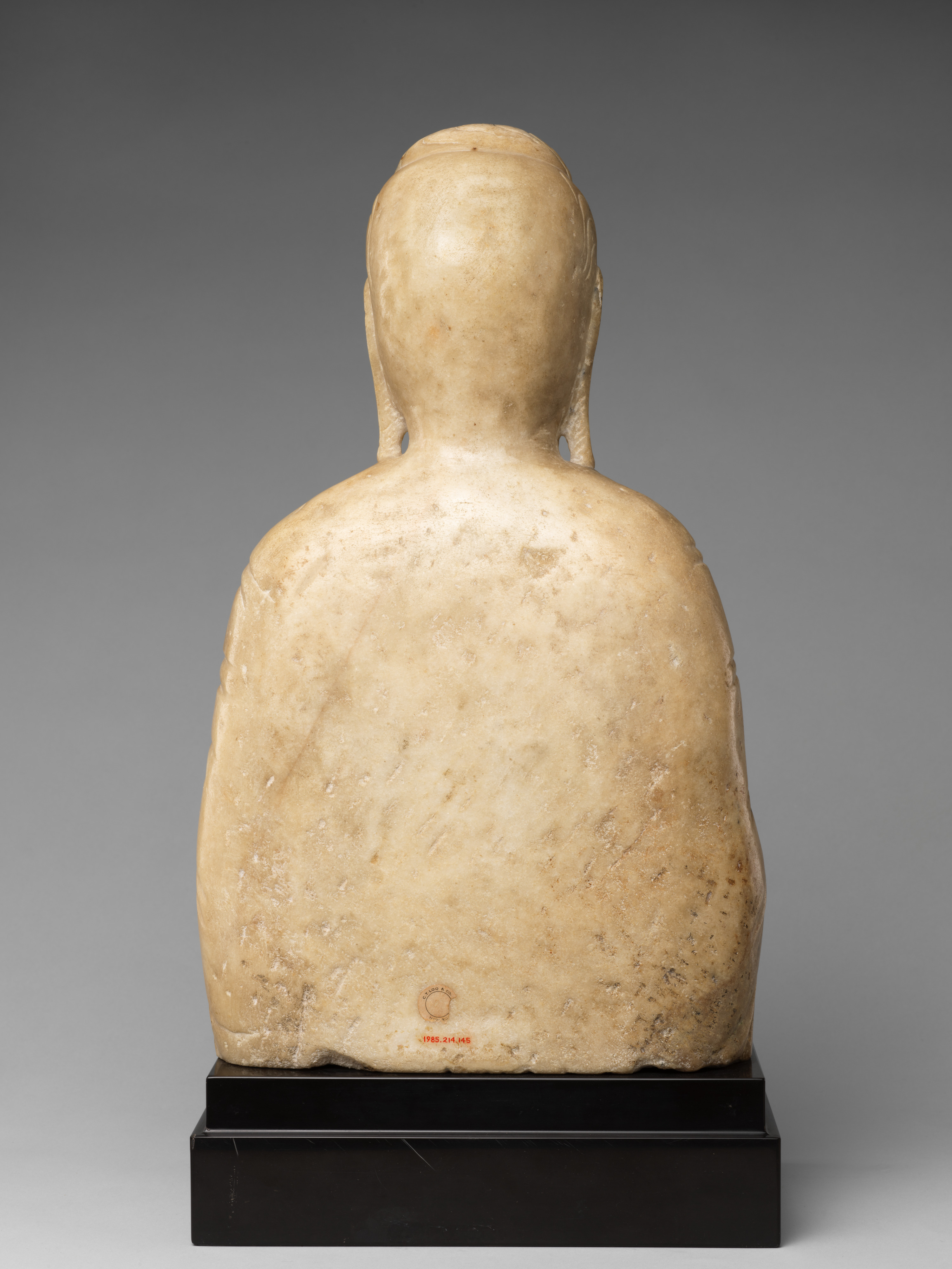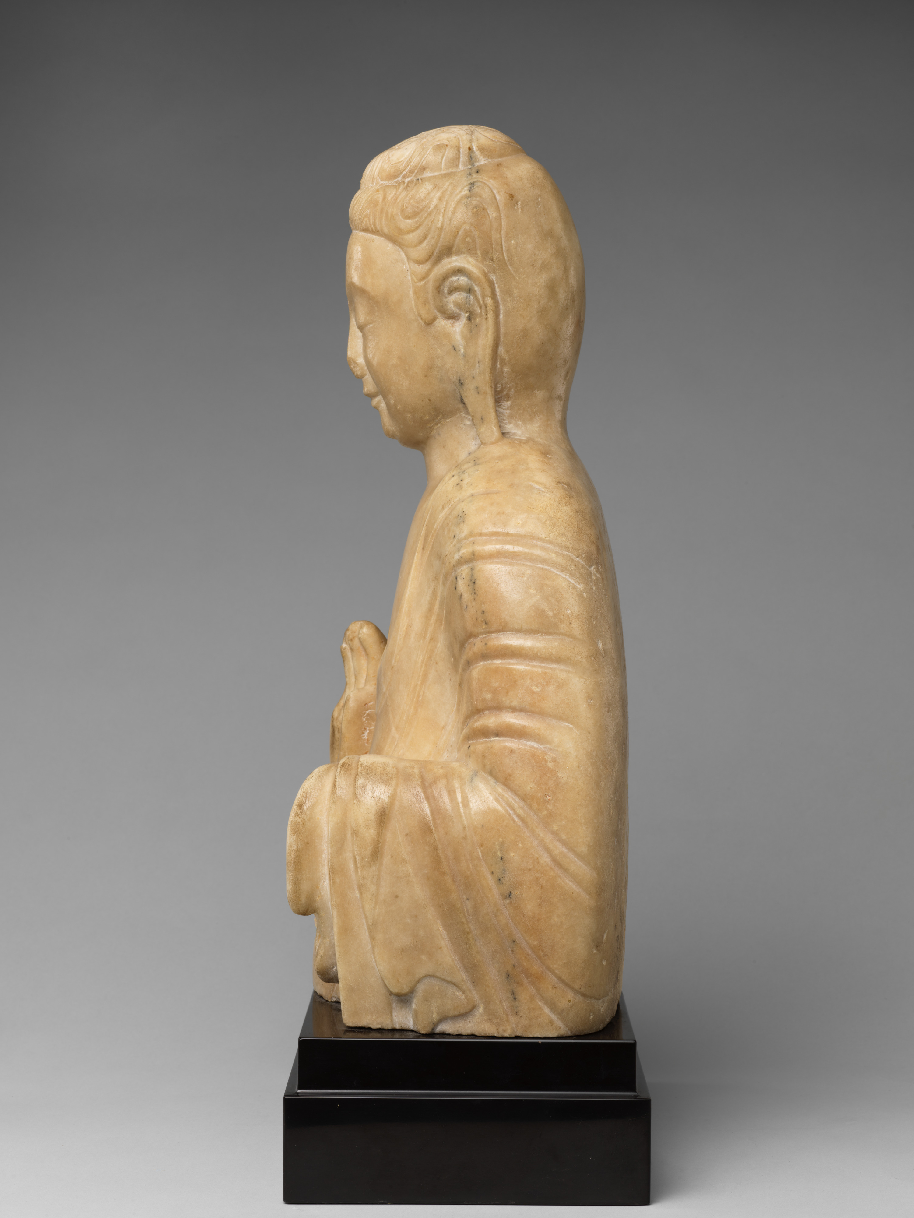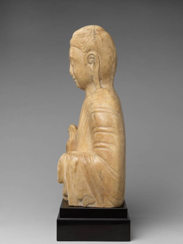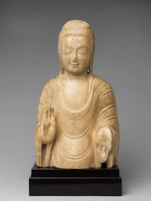 这尊七世纪隋朝大理石雕刻的佛像,发髻呈涡卷状,双耳垂肩,面相圆润,双目微闭低垂,面露微笑,面部表情亲切安详,法相慈悲端庄。身着通肩式佛衣,饰有大U形衣褶纹,衣褶简洁、流畅、舒展。右手施无畏印,左手施与愿印。整尊雕像虽然只有半身,但整体感觉稳重、庄严、造型优美、神态优雅,莹润有光泽、晶莹洁白,熠熠生辉,是难得一见的隋代汉白玉雕刻珍品。