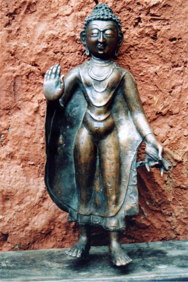 12世纪释迦立像,同为藏西土著模样,头饰螺发,眼嵌白银,炯炯有神。长鼻挺直,嘴唇丰实紧闭。身着披风般通肩袈裟,似逆风而立,袈裟紧贴躯体,体型显露无遗,在上身呈现三道“U”形衣纹。袈裟下部衣边下摆呈叠加状,左手执袈裟衣角,右手结施无畏印,掌心呈外凸状,整体显得神彩飞扬,内透力量美。