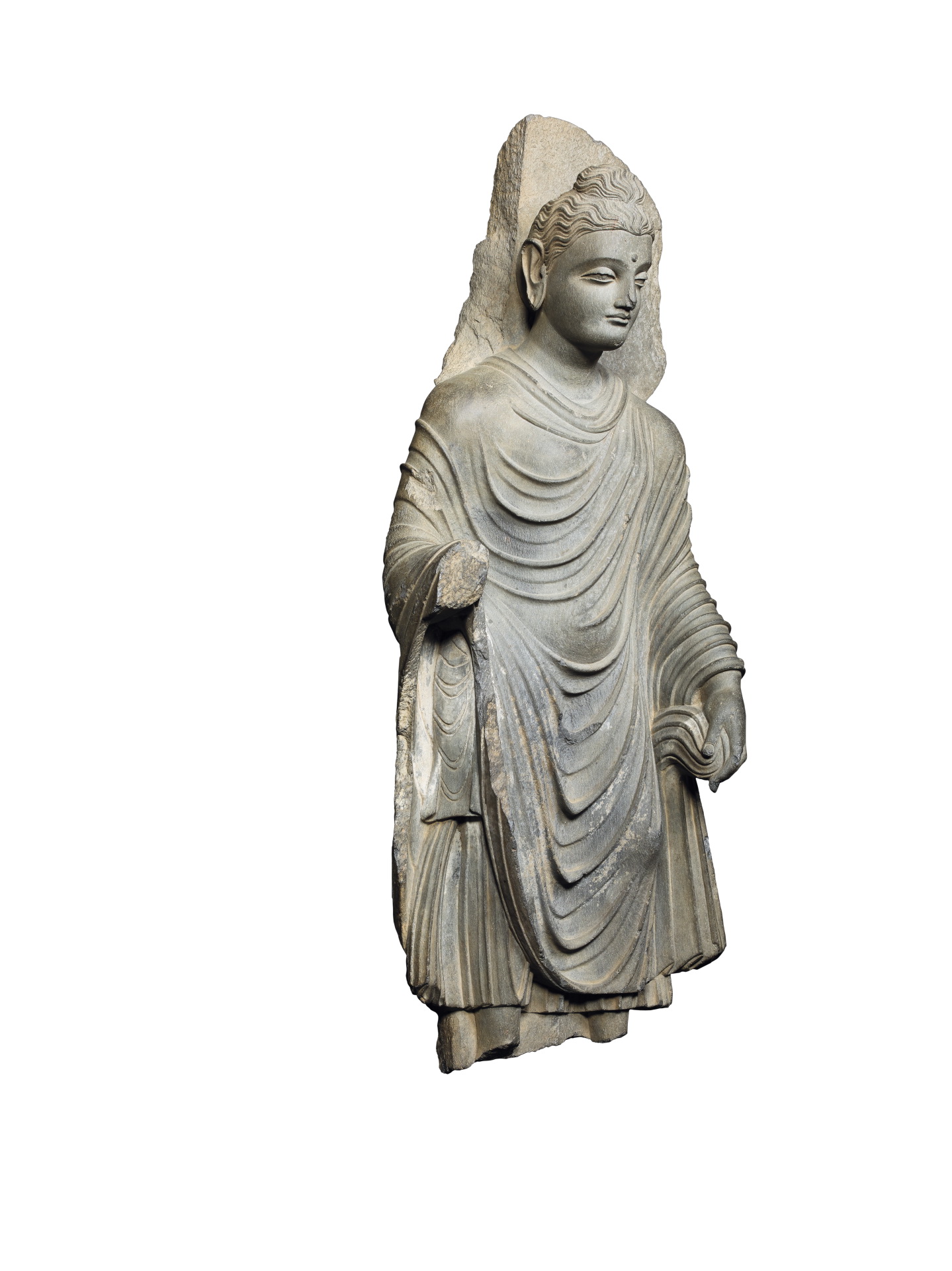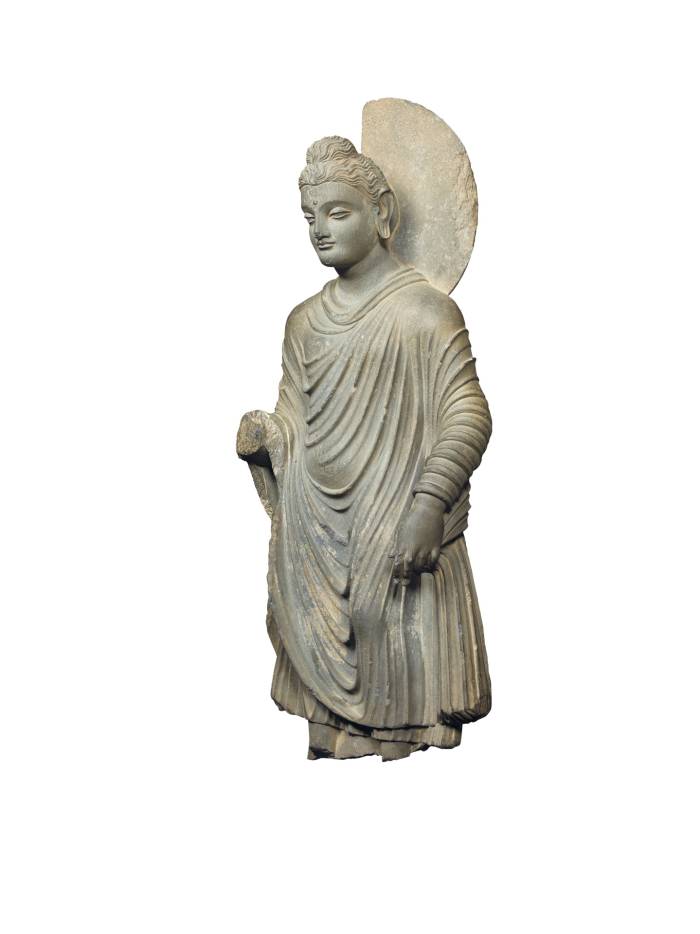 The drapery is meticulously rendered. On the one hand, the fabric follows closely the subtle undulation of the body. On the other hand, the relationship between the garments and the body is clearly indicated by the catenary and ridged folds carved in the round. Although the statue is partially damaged, the realistic style of Gandhāran sculptures is still well-demonstrated.