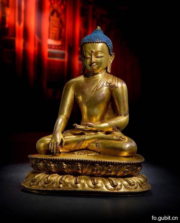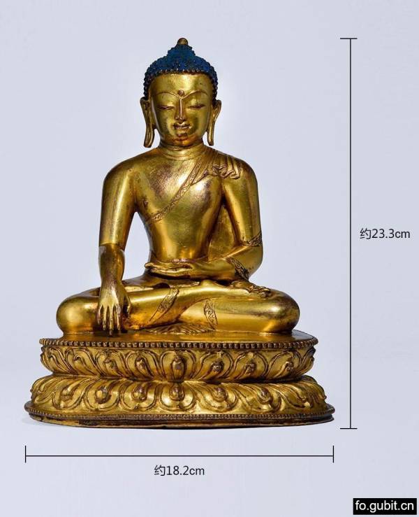 此尊释迦牟尼全跏趺坐姿,头饰螺发,肉髻高隆,宝珠顶严。面相丰满端正,宽额,脸型略呈方圆,五官匀称,高鼻薄唇、眼睑低垂,表情静穆柔和,略含笑意,白毫凸出,双耳垂肩,面相祥和,神情内敛静谧。上身端正,胸部挺拔,肌肉结实,力量感明显。着坦右肩式袈裟,袈裟刻划采用萨尔纳特式手法,衣褶流畅,简洁明快,衣缘处以卷草纹作为装饰,十分华丽精美。袈裟覆至脚踝,下摆于双腿之间微露。双肩平整,肩宽腰圆,身躯挺拔,四肢修长、劲健,整体比例匀称协调。左手置腹前结禅定印,右手作触地降魔印,造像的胸臂健硕,有着强烈的肌肉感,特别是佛陀圆润的手臂及厚实的双手,柔软弹性的青春肌肤表现得栩栩如生。台座上下装饰饱满厚重得连珠纹,双层莲瓣圆润,瓣尖略翘,莲瓣饱满挺括,极富张力,这是14-15世纪以来西藏造像的特征。