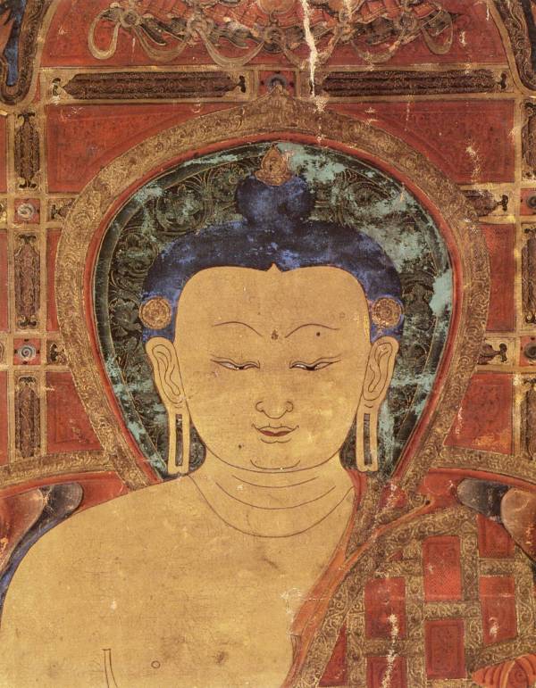 Scroll painting or Thang ka, currently framed, showing Śākyamuni Buddha in bhūmisparśamudrā (earth-touching gesture) flanked by his chief disciples Śāriputra and Maudgalyāyana; around the edge the Arhats. Inscription labels top and bottom.