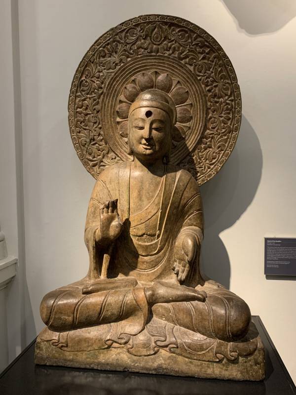 Seated Buddha, limestone, with traces of gesso, paint and gilding, North China, possibly 550-577 (Northern Qi dynasty).