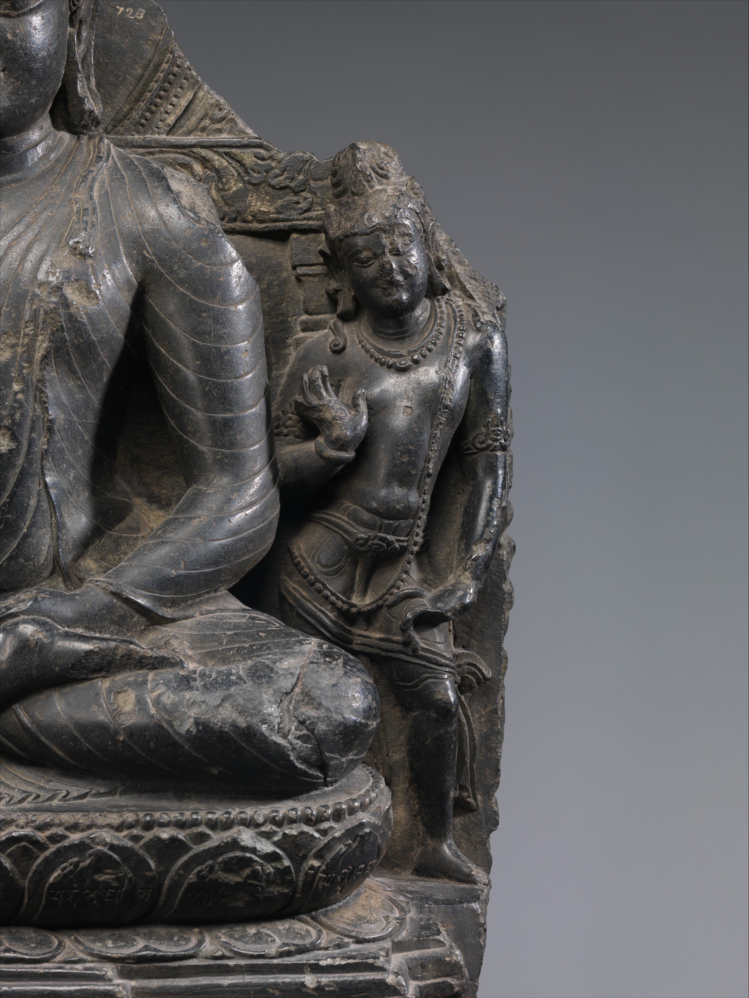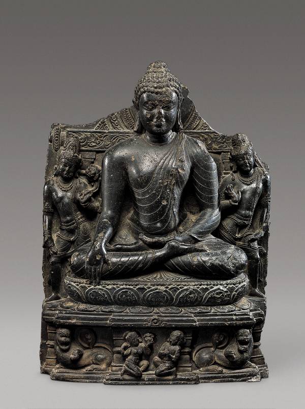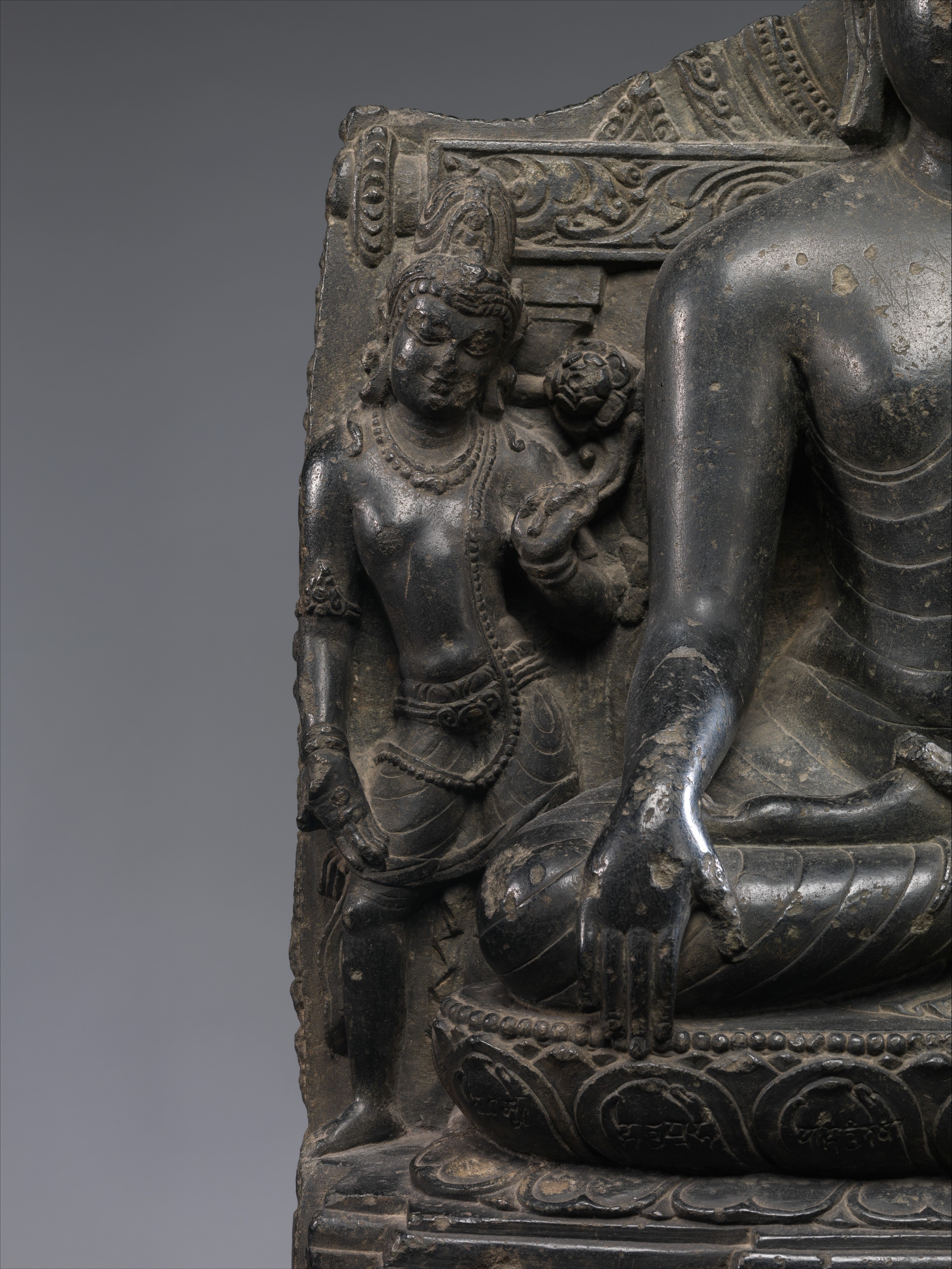 This Buddha from the great monastic site of Nalanda is seen at the moment of enlightenment, with his right hand reaching down to touch the earth, bearing witness to his past refined and meritorious actions, including those in countless past lives that brought him to this point of ultimate realization. The Buddha sits in a yogic posture, deep in meditation. His enlightenment allowed him not only to realize, but also to teach, the Four Noble Truths, as stated in the inscription on his lotus throne: