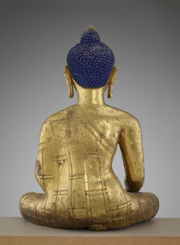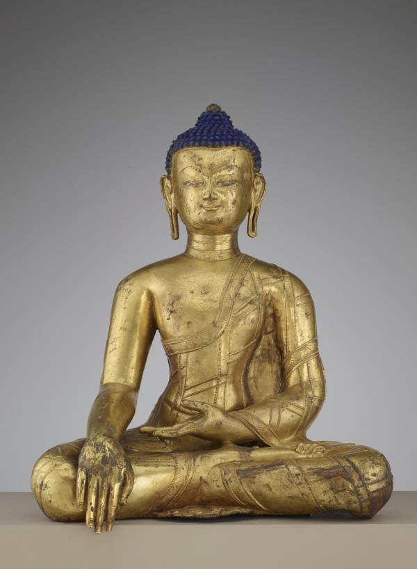 尺寸:45 x 34 x 27 cm 年代:14世纪 质地:铜鎏金彩绘(Gilt copper alloy with pigments) 风格:西藏 来源:美国弗利尔美术馆 参阅:外部链接 鉴赏: Gautama Buddha