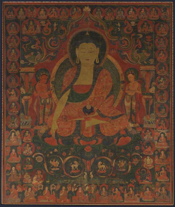 尺寸:102.87 × 87 cm 年代:15世纪 质地:棉地矿物颜料(opaque watercolor on cloth) 风格:藏西 古格 来源:美国弗吉尼亚艺术博物馆 参阅:外部链接 鉴赏: Shakyamuni Buddha with Two Bodhisattvas, Thirty-Five Buddhas of Confession, and Seventeen Arhats
