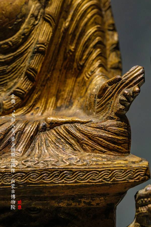 释迦佛结跏端坐,面颊丰润,慈目修眉,两耳垂肩,身披袈裟,右袒,手施无畏印。佛像下面为亚腰四足座,上层作长方形平台,前沿饰绞索纹;中部饰相交的双龙纹,左右两侧各有蹲狮;下层平台前沿饰忍冬纹;前面两足分别饰四个供养人,后面两足分别饰北魏式长颈瓶。佛像及座背面有两个板钮,上竖下横,以设背光之用。底座之背面刻有”大代太和八年”等铭文,弥足珍贵。隆起的衣纹上刻阴线,大衣领口饰折带纹,渴卷式发髻,内着僧衹支的衣纹平行而绵密,宽大的宣字形佛座,加以大舟形光背(此像光背脱落)是太和时期典型的佛造像,在北魏历朝造像中以其刚健有力、纹饰精美而达高峰。